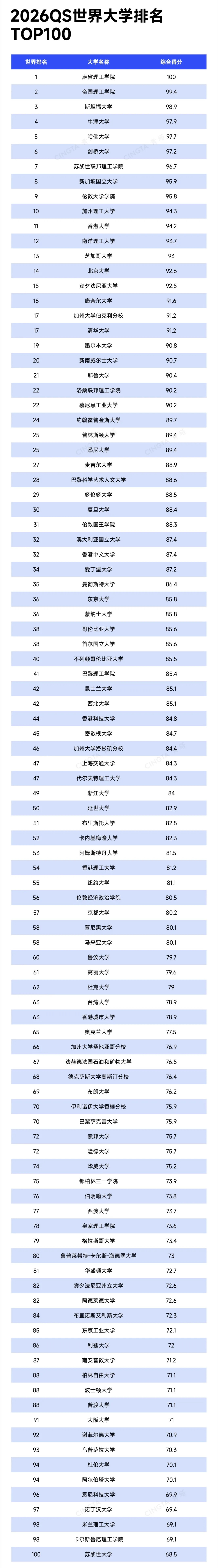 QS于今日正式发布了2026QS世界大学排名。本次排名中国共有11所高校入围QS前100,分别是: