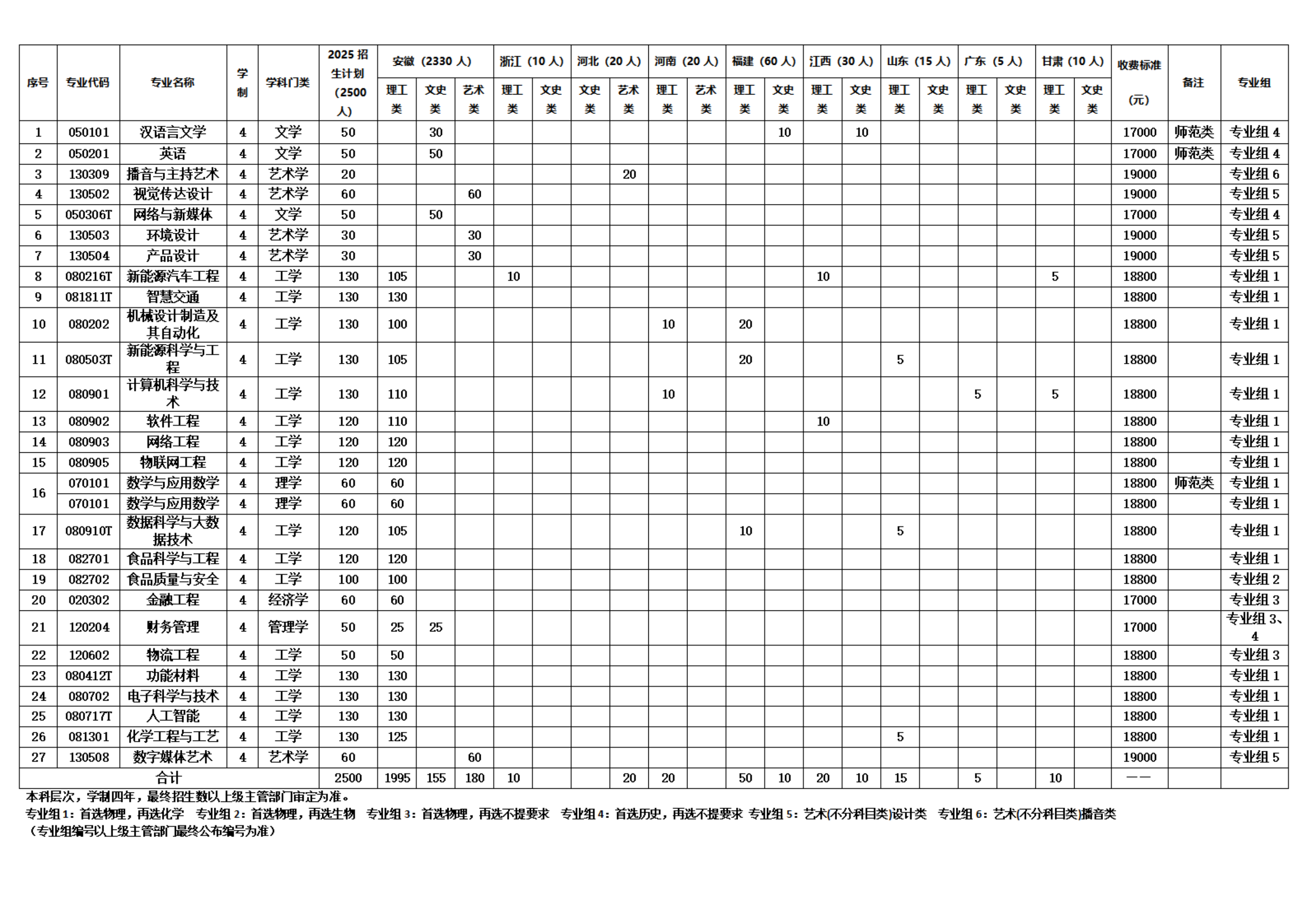 阜阳理工学院2025年分省分专业招生计划