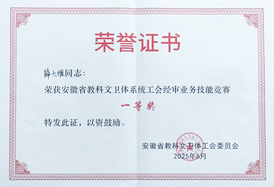 近日,安徽省教科文卫体系统工会经审业务技能竞赛在淮南市圆满落幕。校工会经审委委员薛大维在此次竞赛中表现出色,斩获竞赛一等奖。