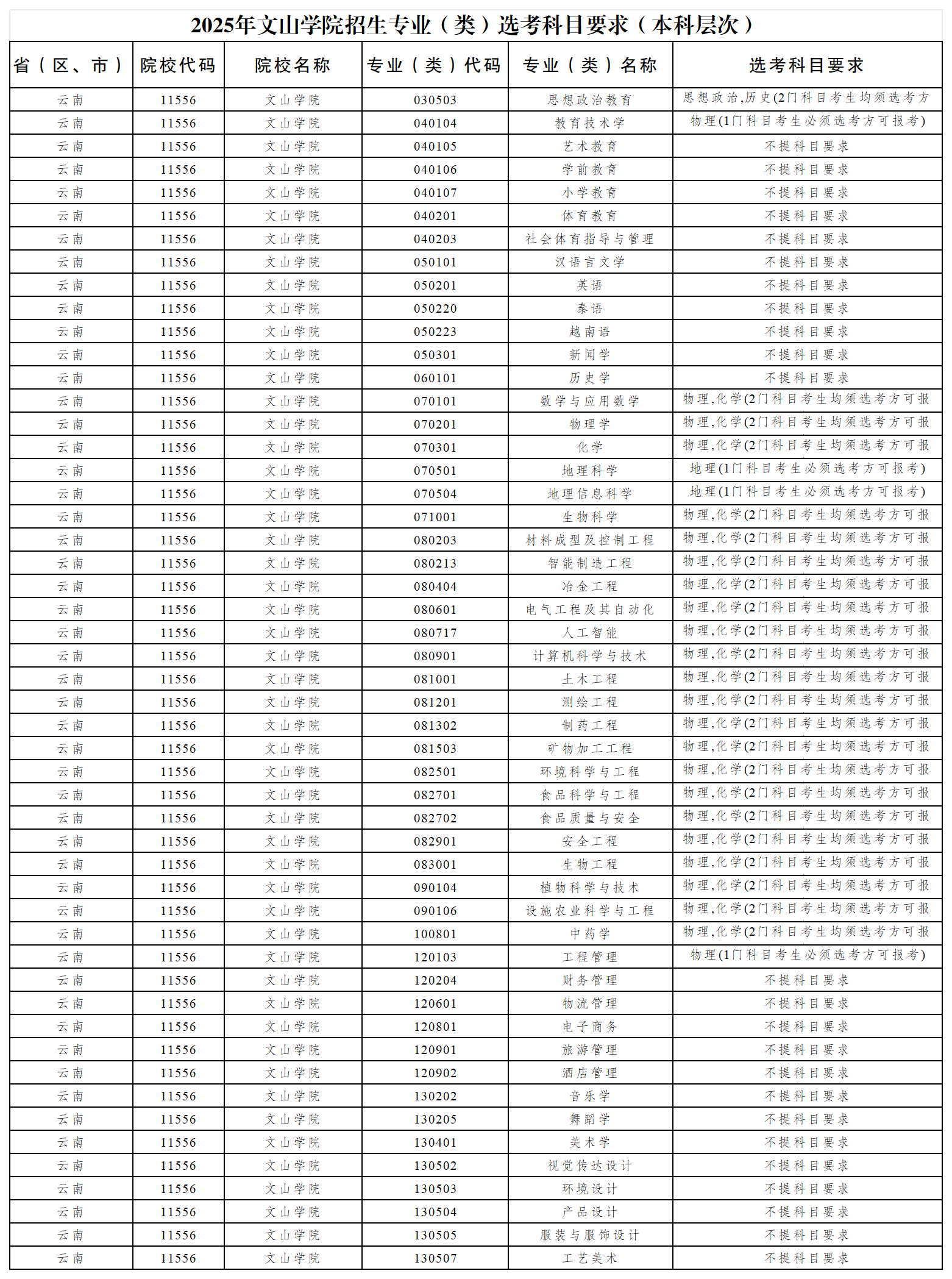 2025年文山学院招生专业(类)选考科目要求(本科层次)