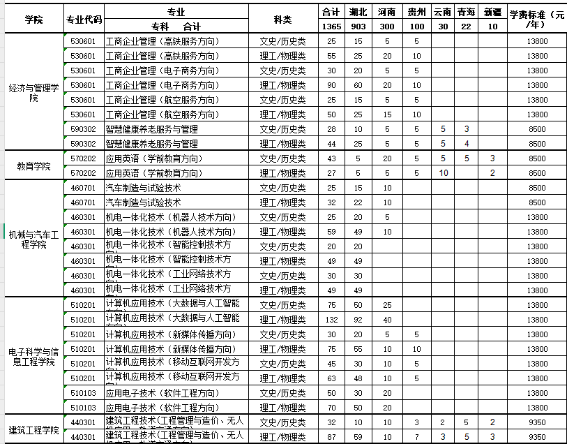 湖北文理学院理工学院2025年普通高职(专科)分省分专业招生计划
