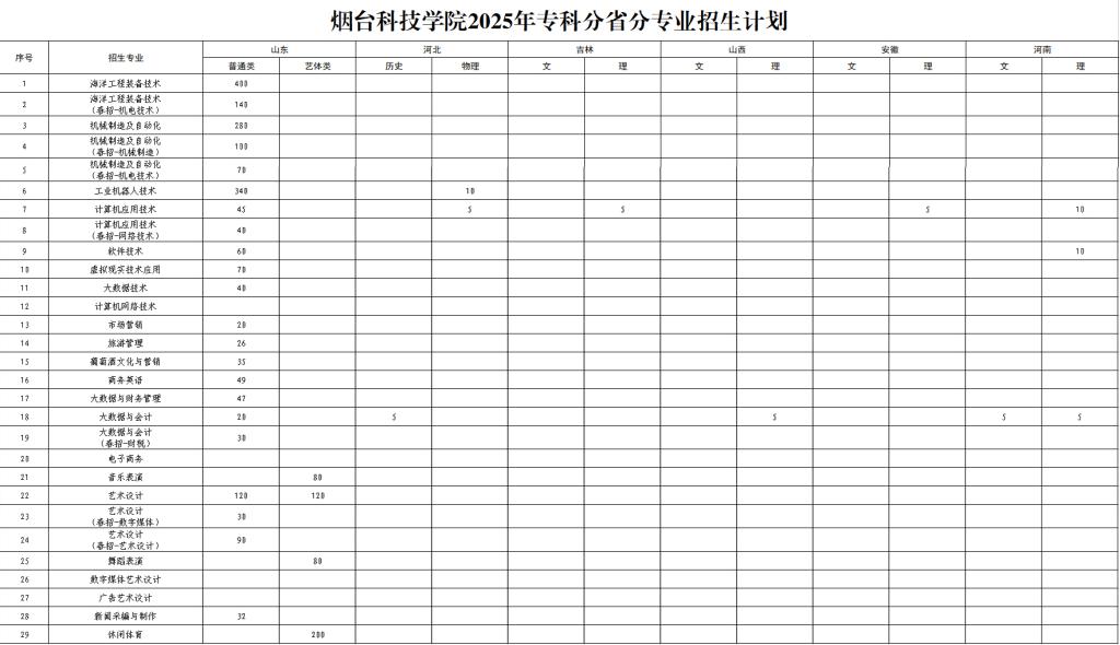烟台科技学院2025年专科分省分专业招生计划