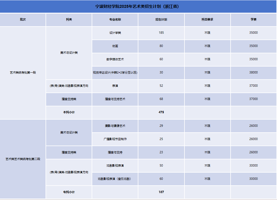 宁波财经学院2025年艺术类招生计划(浙江省)