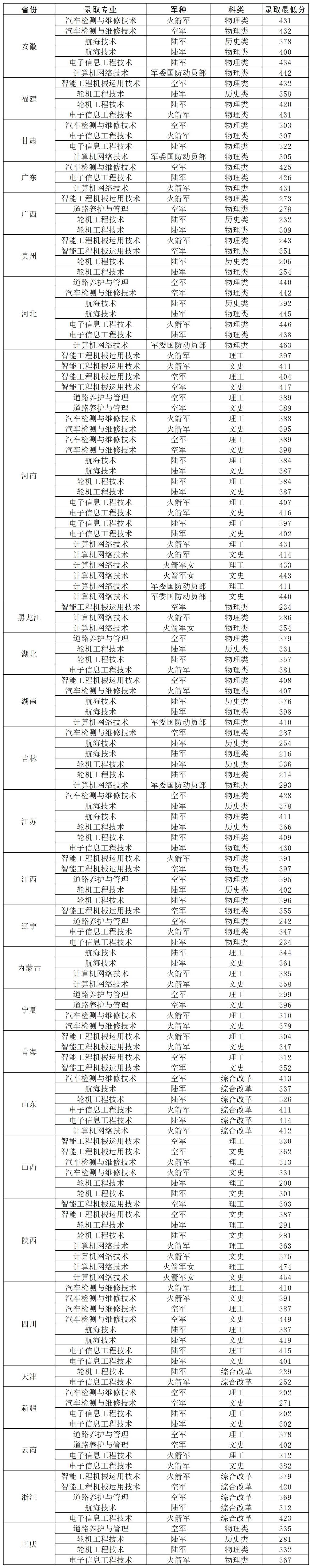 2024年定向培养军士各专业录取分数线