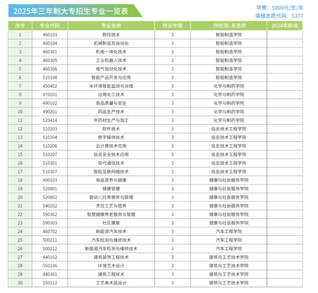 学院现开设有智能制造、化工、生物制药、信息技术、社会服务、汽车、建筑等专业大类共30个专业,现有在校生8000余名学生。