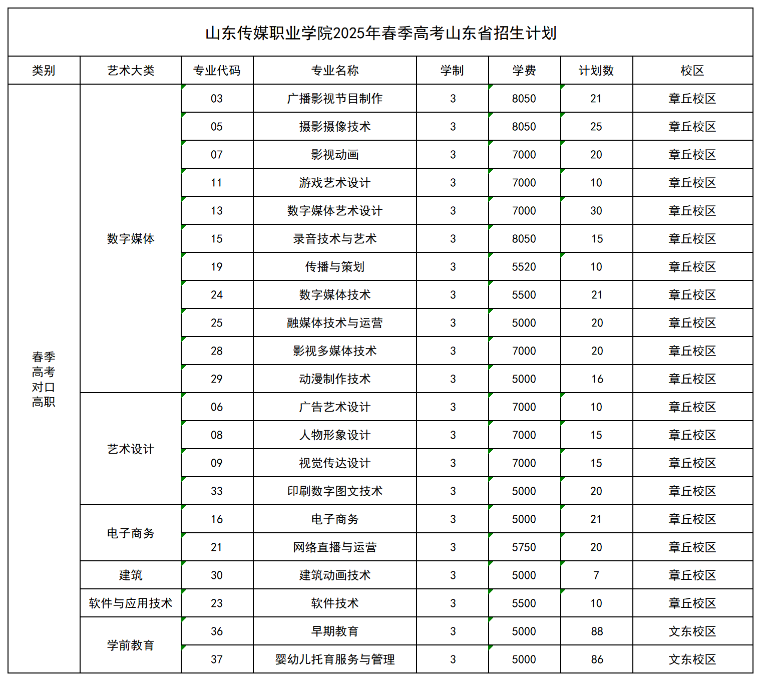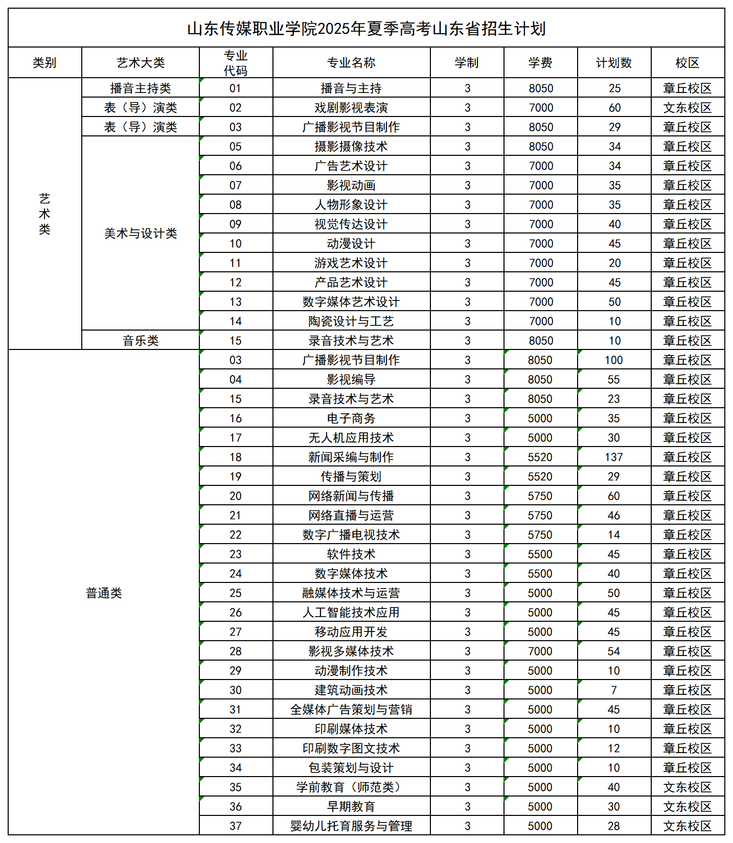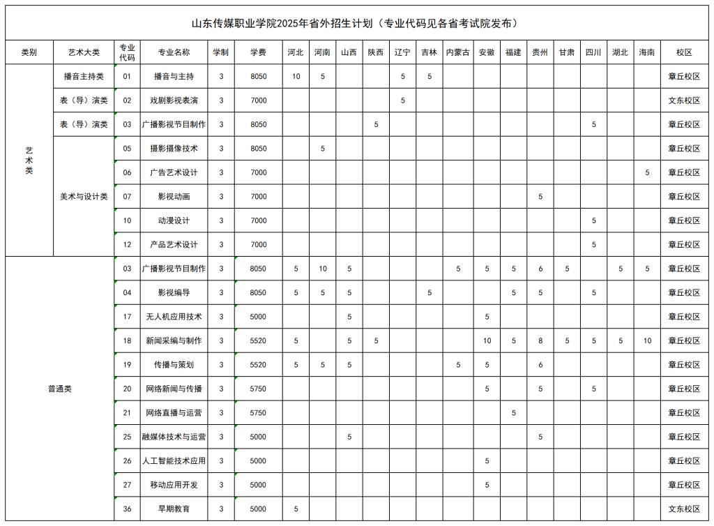 山东传媒职业学院2025年招生计划(省内常规批、艺术批、春季高考批,省外计划)