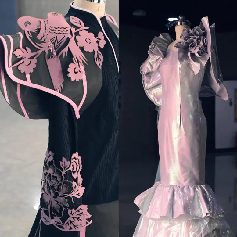 《服装工艺与结构4》解构唐代形制,融合数字印花与可持续工艺,创新演绎宝相花纹样数宇化转译,立体剪裁等技法,以当代设计语言描绘大唐盛装。