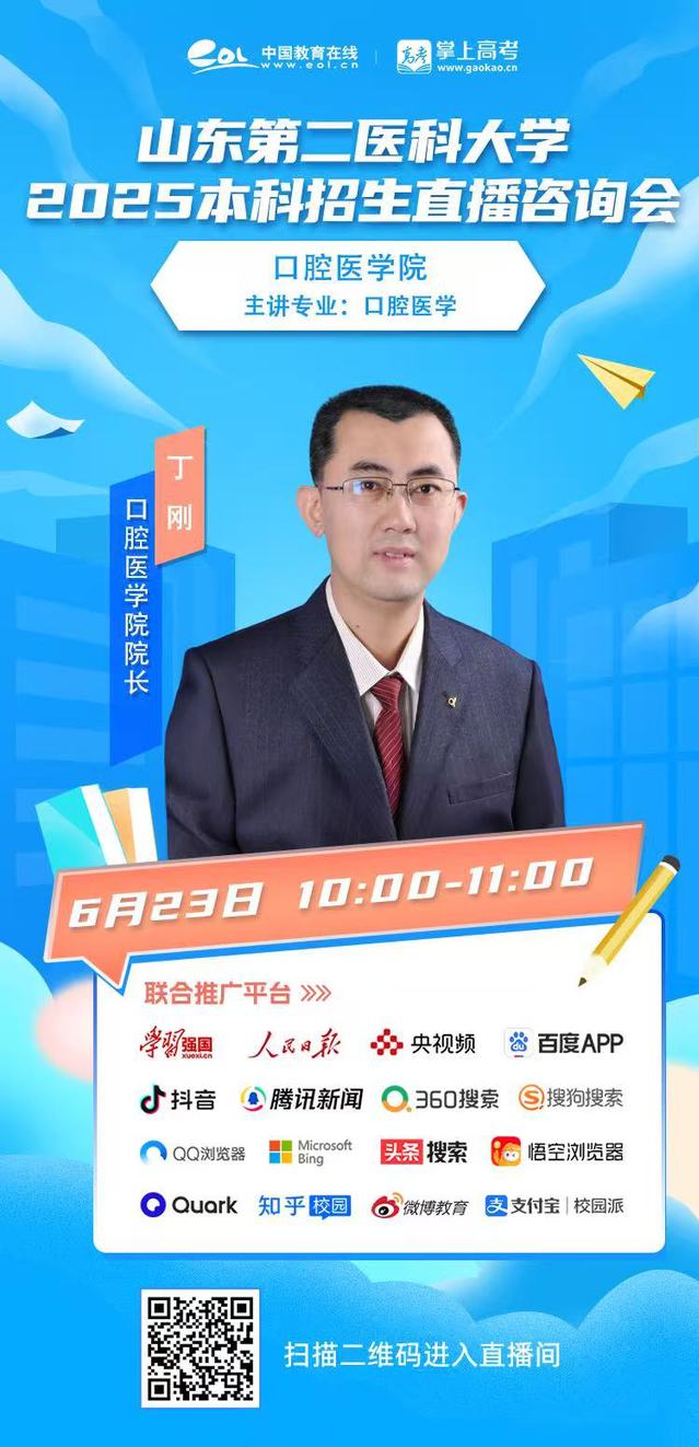 山东第二医科大学“院长谈专业”节目预告:6月23日10:00-11:00,口腔医学院专场,口腔医学院院长丁刚教授带您全方位深层次了解口腔医学专业,欢迎广大考生及家长扫码观看。