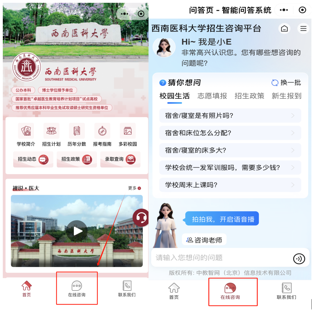 西南医科大学智能招生问答系统已接入DeepSeek大模型,各位考生及家长可通过西南医科大学本科招生官网、本科招生小程序两种方式进行在线咨询。
