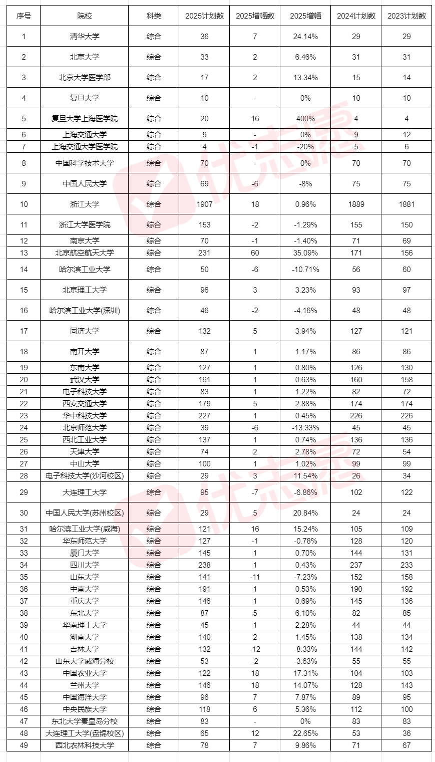 此外,中国科学技术大学、复旦大学等10所院校计划数维持不变;浙江大学虽基数庞大,达1907人,但增幅不足1%。北京大学医学部、中国农业大学等院校则有小幅调整,整体趋势平稳。总体而言,2025年985院校招生计划呈现两极分化,部分院校大幅扩招或缩招,多数院校保持稳定微调。