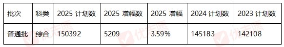 2025年普通批综合类招生计划数为150392人,较2024年增加5209人,增幅为3.59%。