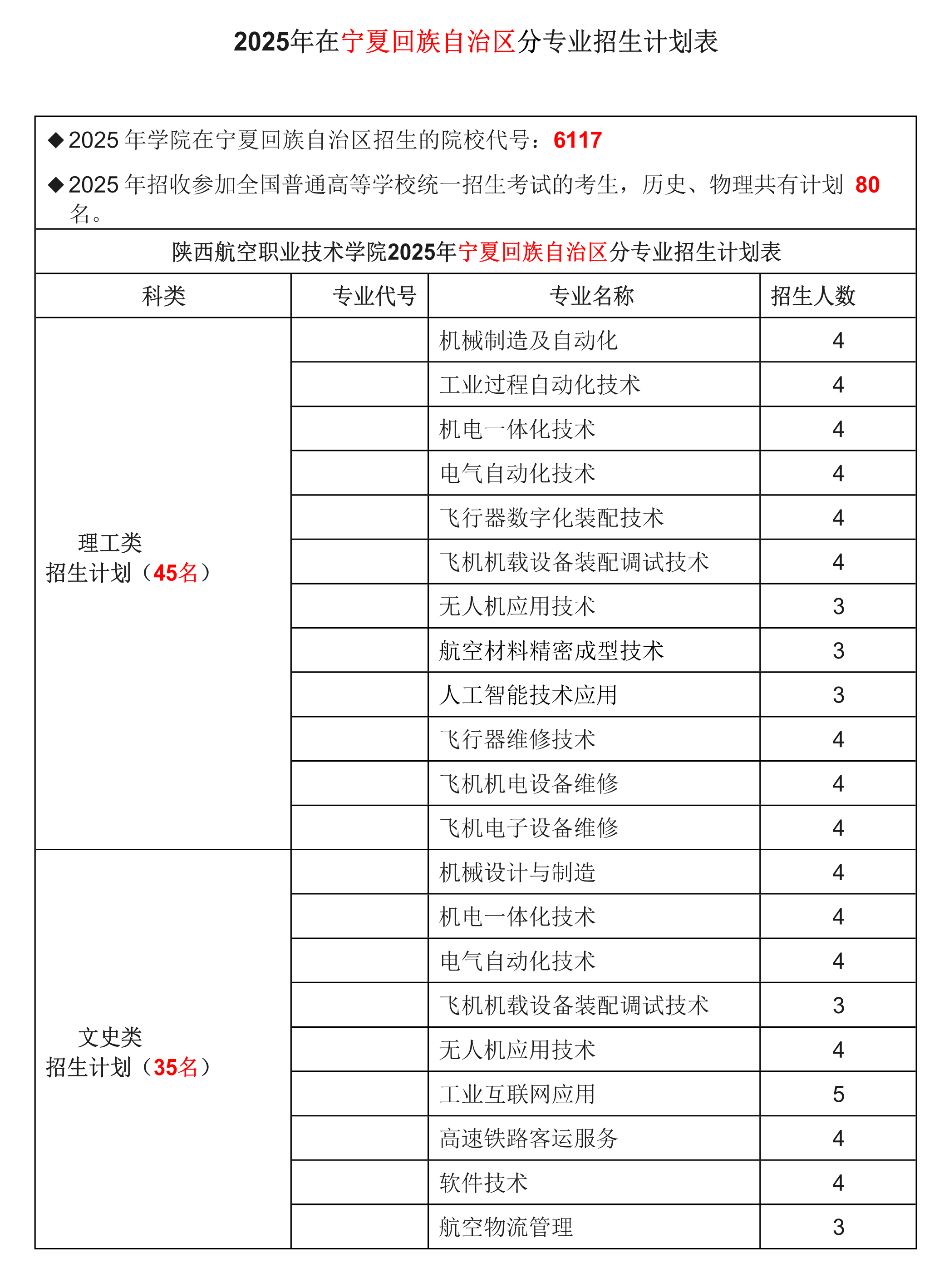 陕航职院2025年宁夏回族自治区招生专业计划表