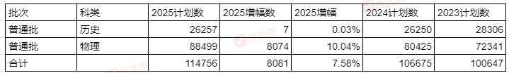 整体上,物理类招生总量比2024 年略降1.2%,历史类下降4.5%,延续了近几年文科缩减、理科稳定的调整趋势。超过六成的院校物理类招生计划波动较小(变化在±5% 以内),但历史类计划波动更大,只有45%的院校保持不变。