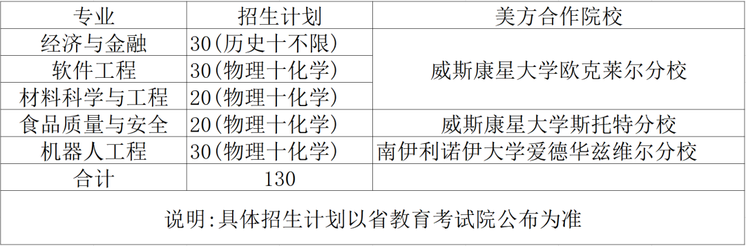 项目学生按中美大学制订的联合培养方案赴美学习两年,第一至第三学期在中国学习,第四至第七学期在美国学习,第八学期返回中国学习,所修课程符合中美双方学位和毕业要求,获颁中美大学双学位和中方毕业证书(如不出国,无法获得国内学位)。项目学生的中方学费同其他普通学生,美方学杂费由美方另行收取,每年约21万人民币(含学费、保险费和食宿费)。本项目专业课以英语授课为主,需有一定的英语基础。本项目不接收无出国意愿的考生。