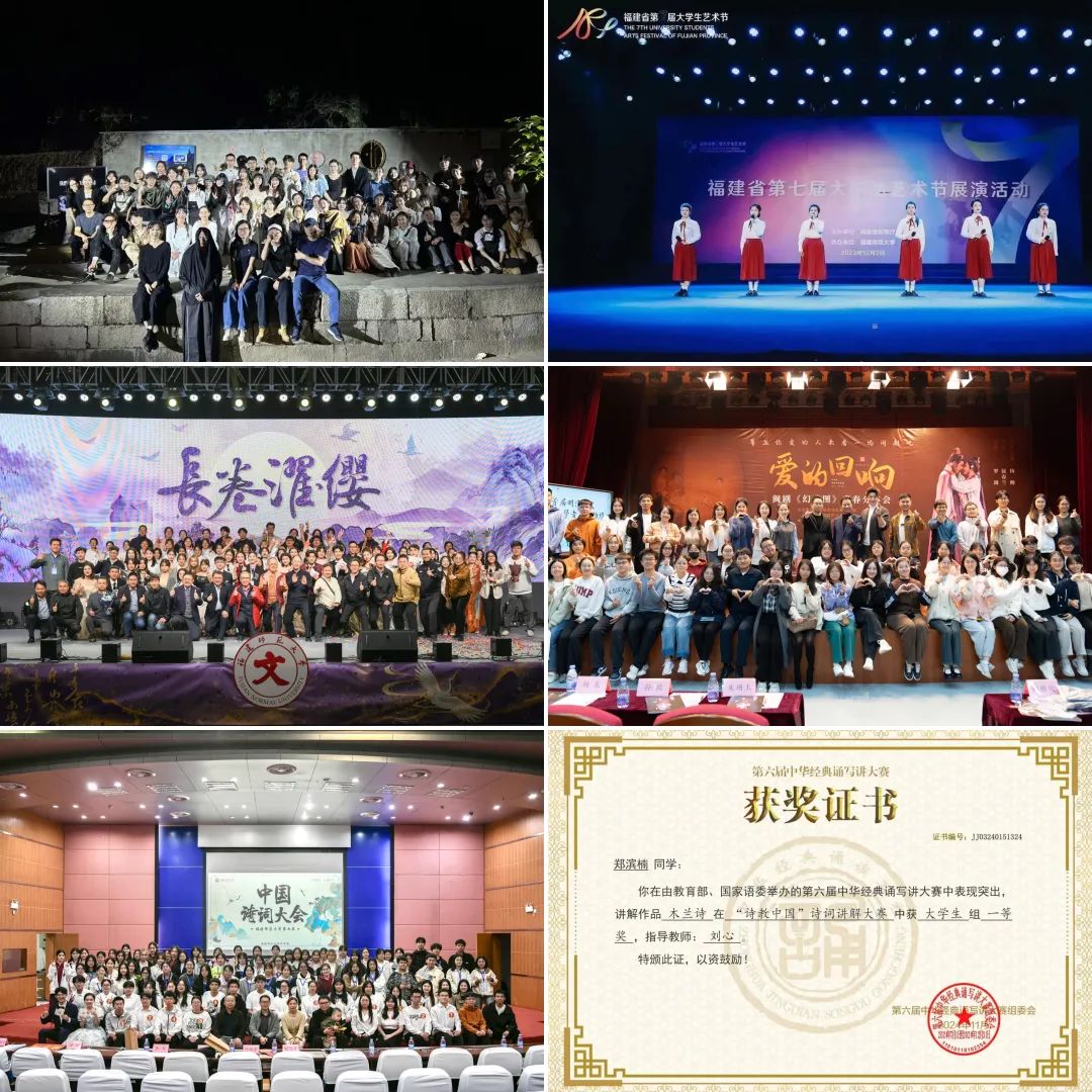 学院依托拔尖人才培养优势,通过社会实践、创新项目培育学生创新实践能力,学生荣获第七届中国国际大学生创新大赛(原“互联网+”)国赛金奖,“挑战杯”全国大学生课外学术科技作品竞赛全国二等奖、红色专项全国三等奖,首届全国大学生新文科实践创新大赛2金1银,首届中国研究生“文化中国”两创大赛二等奖2项、三等奖2项等。此外,学院学子坚持“知行合一,注重在实践中学真知、悟真谛,加强磨炼、增长本领”,围绕文化传承、文学创作、闽台地方文化、乡村振兴、志愿服务等社会热点,在社会课堂中受教育、长才干。学院获评全国暑期社会实践优秀单位,学生社会实践成果获评全国“三下乡”社会实践百篇优秀调研报告等,社会实践活动得到新华社、《光明日报》、福建日报、学习强国、福建高校思政网、新福建等各类主流广泛媒体报道,充分展现了我院学子自觉投身实践、勇担青年使命的精神风貌。