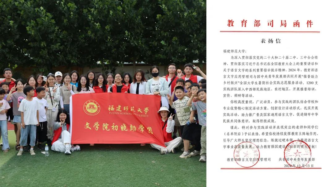 “跨越山海,闽宁推普”实践队获教育部语言文字应用管理司和共青团中央青年发展部的通报表扬