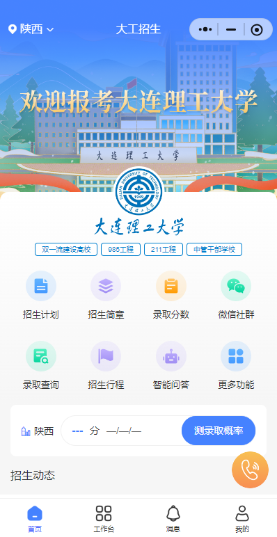通过大连理工大学本科招生小程序,一键获取招考信息、在线宣讲、计划分数查询、宣传行程浏览、分省微信加群、报考志愿反馈、学院学科专业、报考指南申领、常见问答等功能。