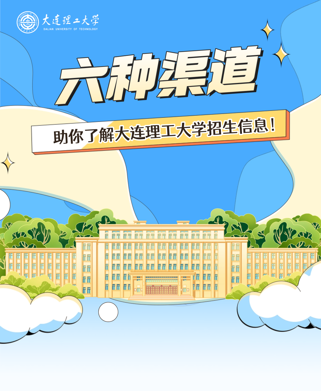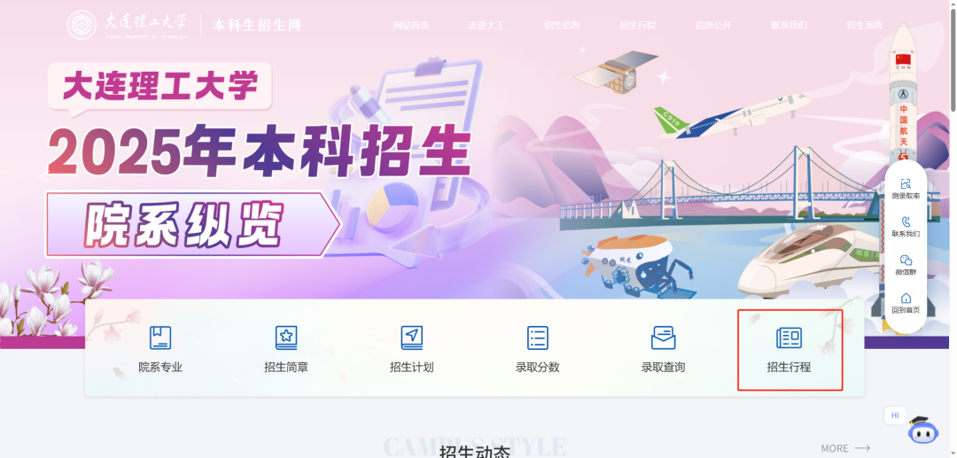 关注“大工招生”微信公众号,考生可进一步了解学校办学情况、人才培养特色、历年招生计划及录取分数等,还可以实时查询我校各省份招生组行程安排。“院系纵览”“分省招生咨询热线”等特色版块,帮助大家深入了解大工各个专业特色和人才培养方案,让你更明确自己的规划和目标!