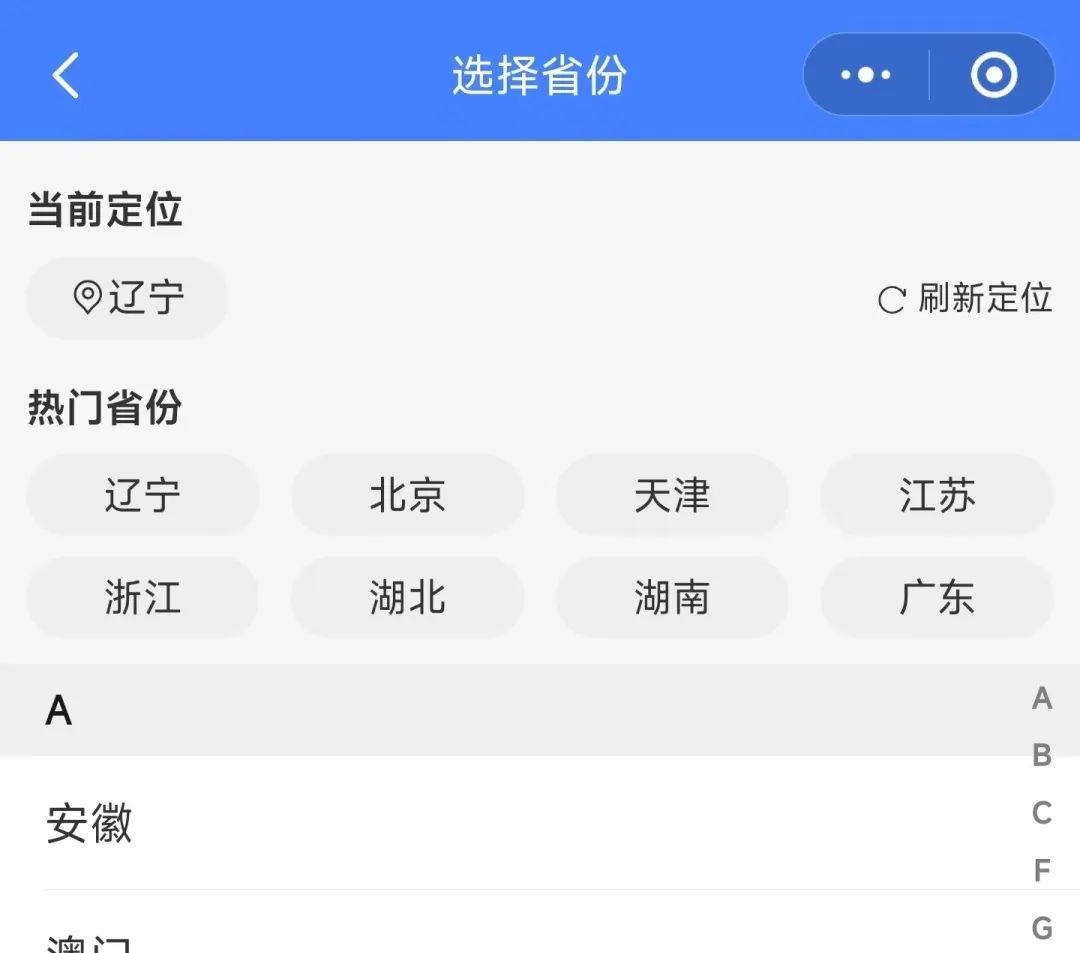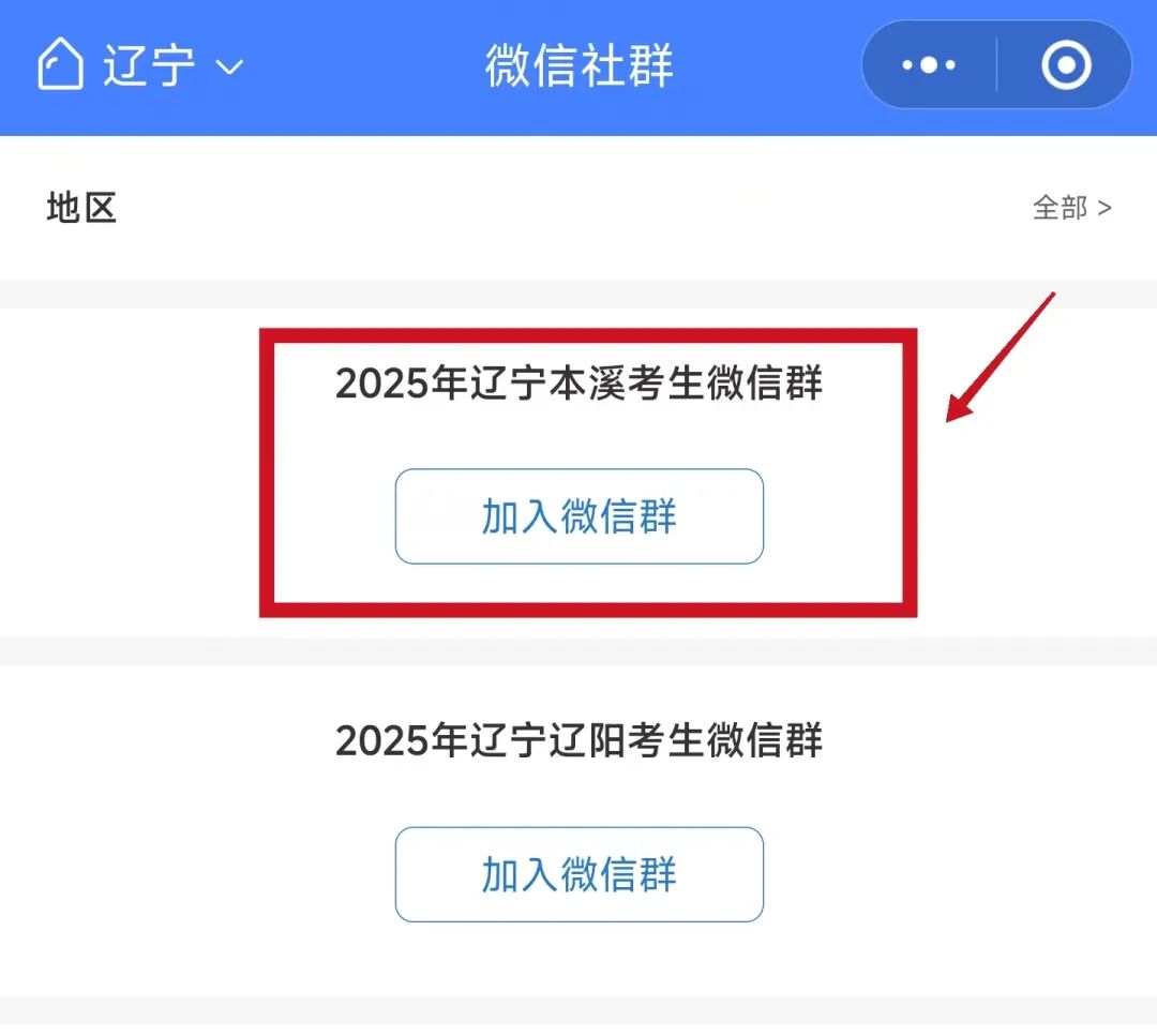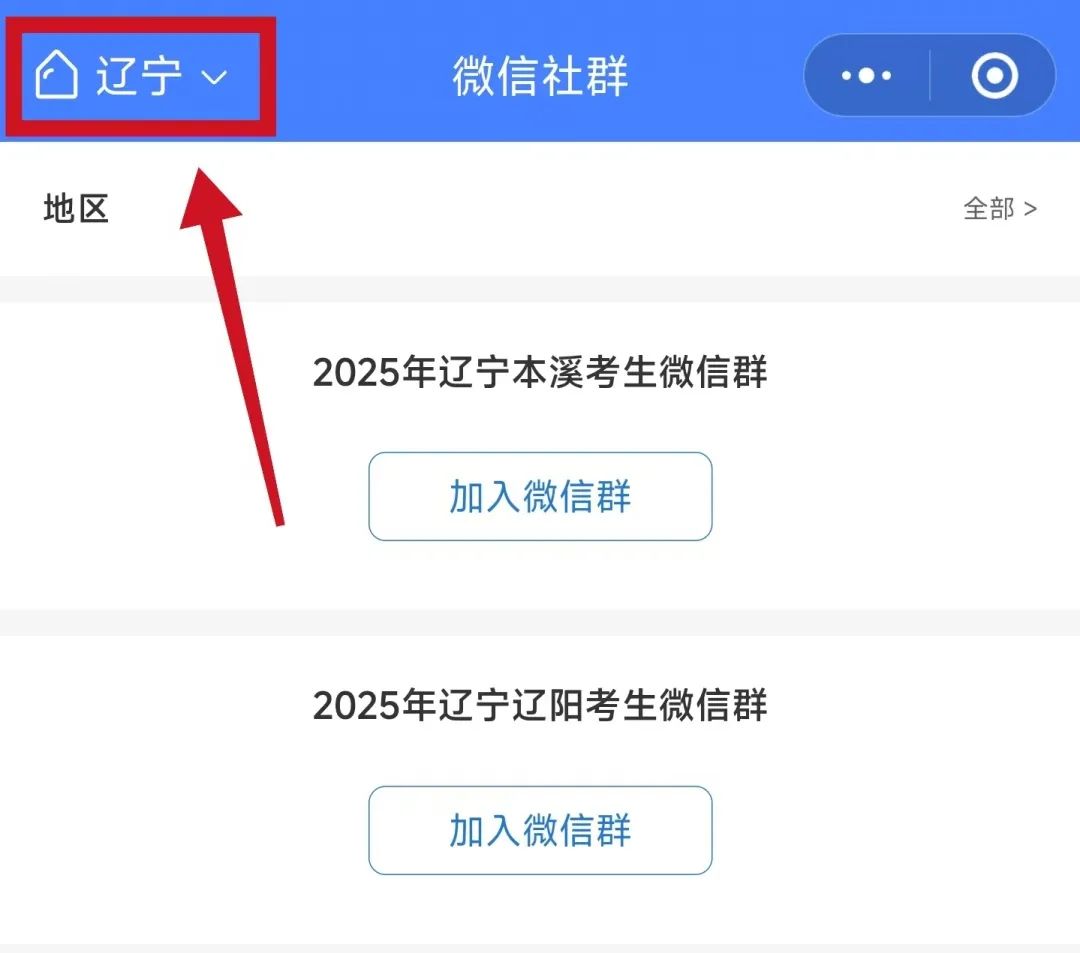 2、点击左上角选择所在地区,选择考生所在省份的微信群(辽宁省内考生选择市微信群)