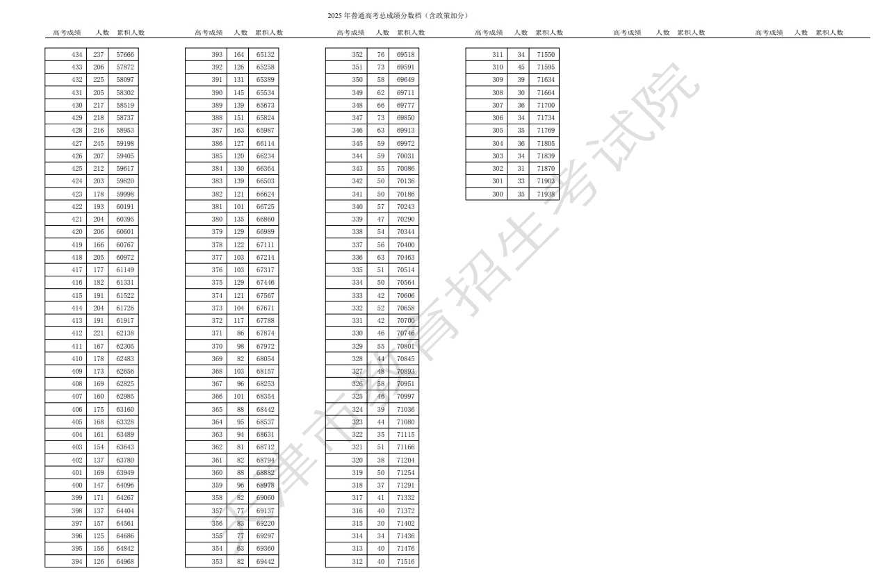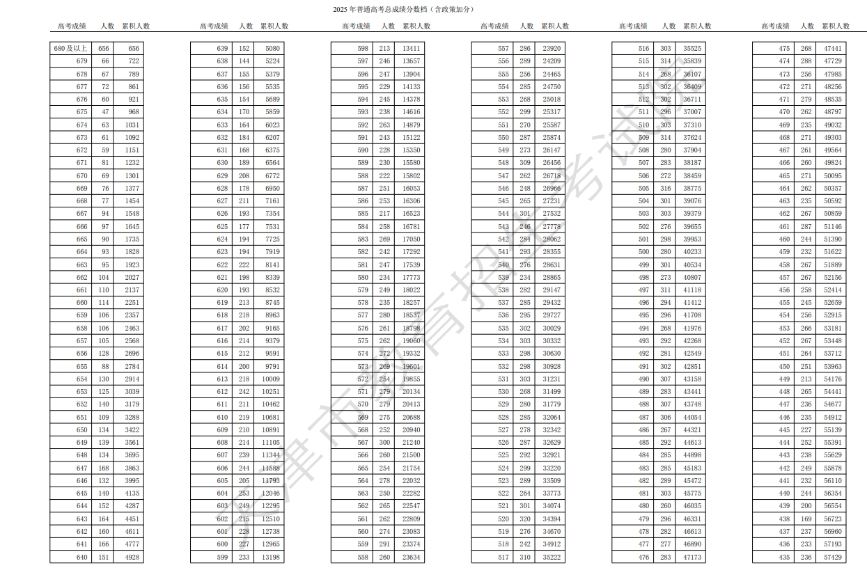 来源:天津招生考试院 2025年高考总成绩分数段统计情况