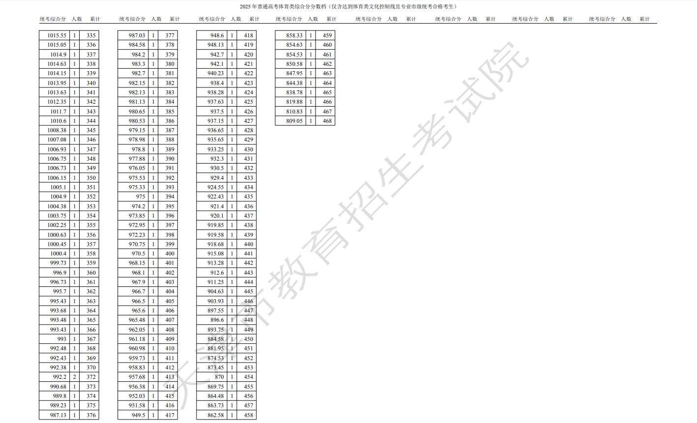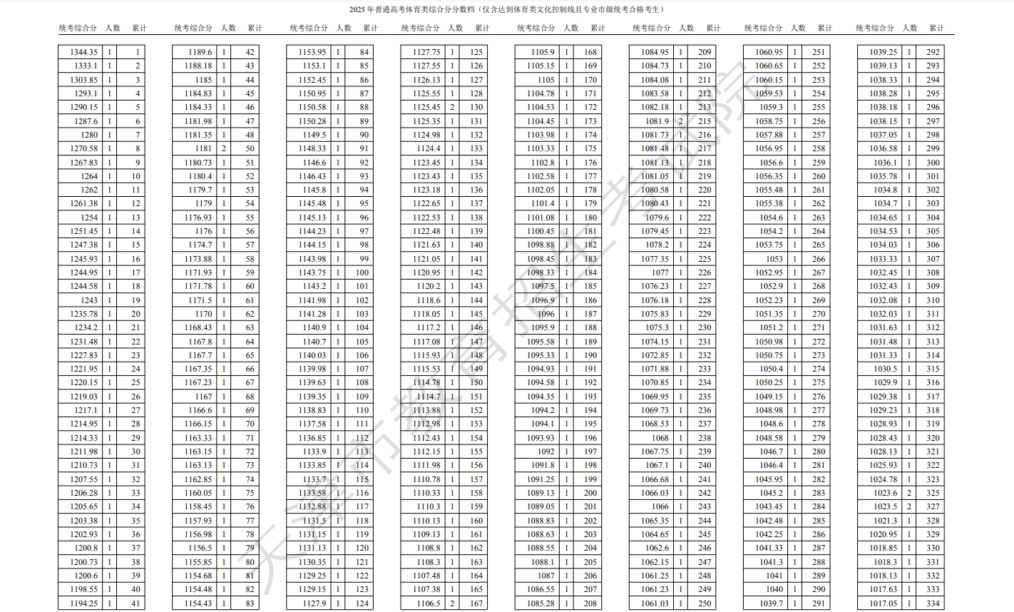 文章来源:天津招生考试院 体育类综合分分数段情况