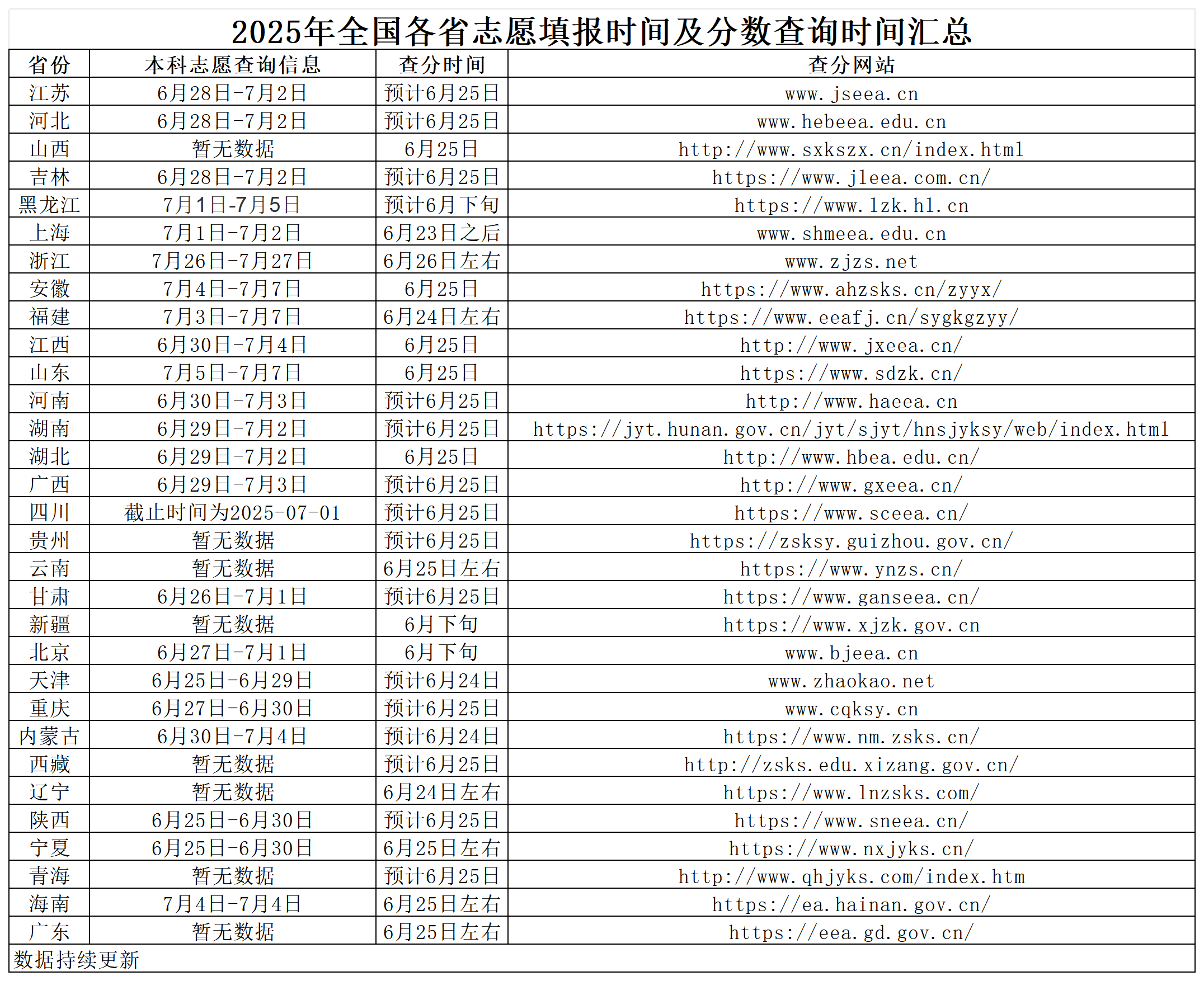 2025年全国各省志愿填报时间及分数查询时间汇总