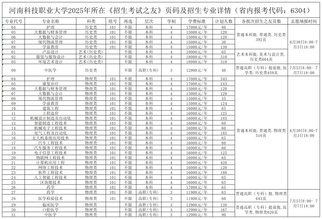 河南科技职业大学2025年所在《招生考试之友》页码及招生专业详情(省内报考代码:6304)