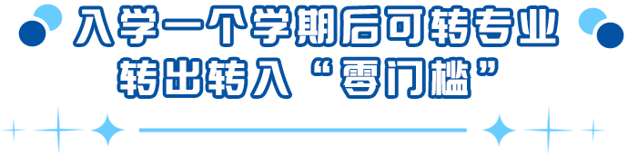 普通类学生入学一个学期后,专业转出转入 “零门槛”,不面试,不考试,不受选科限制,不设单科成绩、高考成绩、期末成绩等任何要求,学生提出申请即最大程度满足学生兴趣爱好,确保每位符合条件的学生都能顺利转入心仪专业。艺术类、体育类、音乐类学生只能在艺术、体育、音乐同类专业内互转,不得转入普通类其他专业,舞蹈编导专业不可转入、转出。