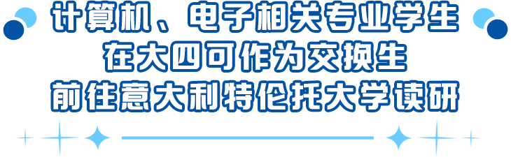 大学期间符合条件的计算机学院和电子信息工程学院学生可报读,在本科第四年作为交换生前往意大利特伦托大学信息工程和计算机科学系学习一年,交换学习期间提前修读相关硕士学位课程,每年的名额为20名。