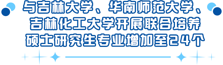 为进一步拓宽毕业生升学路径和教学资源,学校在新一代电子信息技术、通信工程、计算机技术、材料与化工、生物与医药、公共卫生、金融、软件工程、国际商务、人工智能、机械、翻译、国际商务、数字经济、化学工程与技术(03应用化学方向)、化学、机械工程、控制工程、仪器仪表工程、材料科学与工程(02材料加工工程和03材料学方向)、材料工程、企业管理、技术经济及管理、会计、英语笔译等24个专业学位领域与吉林大学、华南师范大学、吉林化工大学联合培养专业学位硕士研究生,共招生301人。