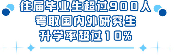 学校高度重视学风建设,鼓励学生毕业后继续深造,每年都有许多毕业生考取国内外研究生,升学率超10%,居全省同类院校第一,并超过多所公办学校(其中2023届毕业生901人考研升学成功,2024届毕业生801人考研升学成功)。