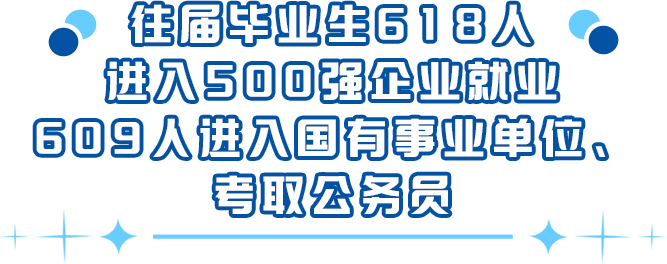 以2024届毕业生为例,618人进入500强企业就业,签约单位集中于珠海市、广州市、深圳市等粤港澳大湾区重点城市群,就业领域集中于信息科技、先进制造业、现代服务业等重点领域,行业优势突出,包括在珠海格力、纳思达股份等世界/中国500强头部企业就业。609人进入国有企事业单位、考取公务员。