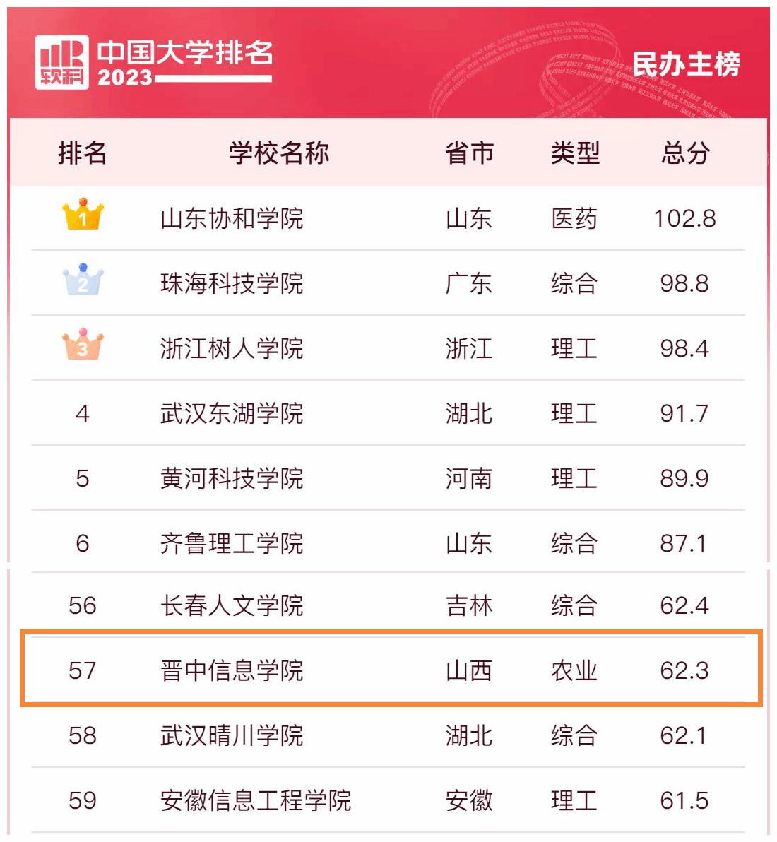 2023年3月30日,高等教育专业评价机构软科正式发布“2023软科中国大学排名”,学校凭借新颖的教学特色、多元化的育人模式以及良好的社会声誉在山西省民办本科高校中名列第一。
