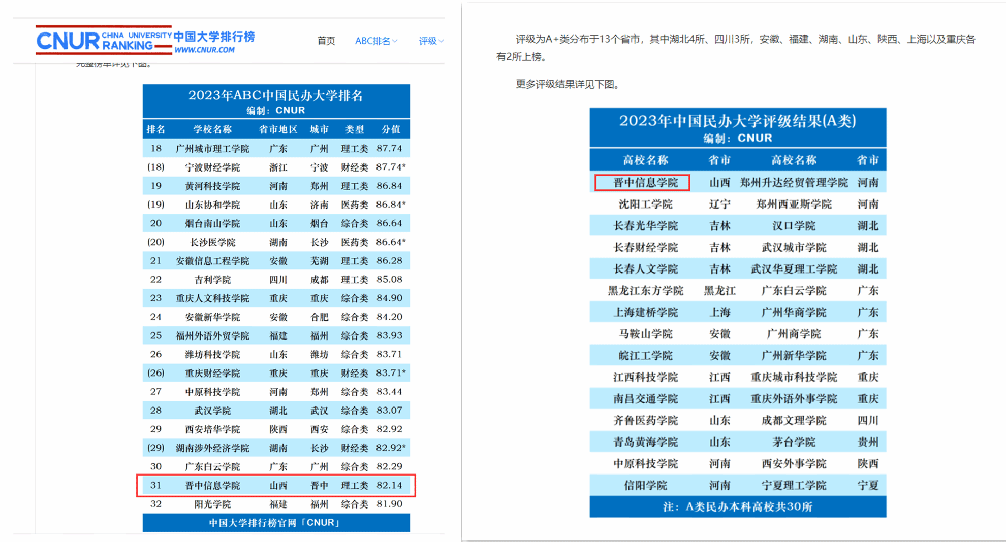 此外,2023年6月28日,武书连2023民办大学综合实力排名发布,我校位列山西省第一。2023年3月20日,据权威媒体发布的《山西7所民办本科院校排名》报道,我校名列山西民办大学第一。2023年,在ABC中国民办大学排名中我校位列全国第31位,山西民办第一。在校友会民办排行榜中我校位列全国第80位,区域一流应用型大学。在顶端教评排名中,山西民办本科院校满意度排名中我校位列山西省第一。在2023中国民办本科高校质量排行榜(百强榜单)中我校位列全国第5,山西省第一。