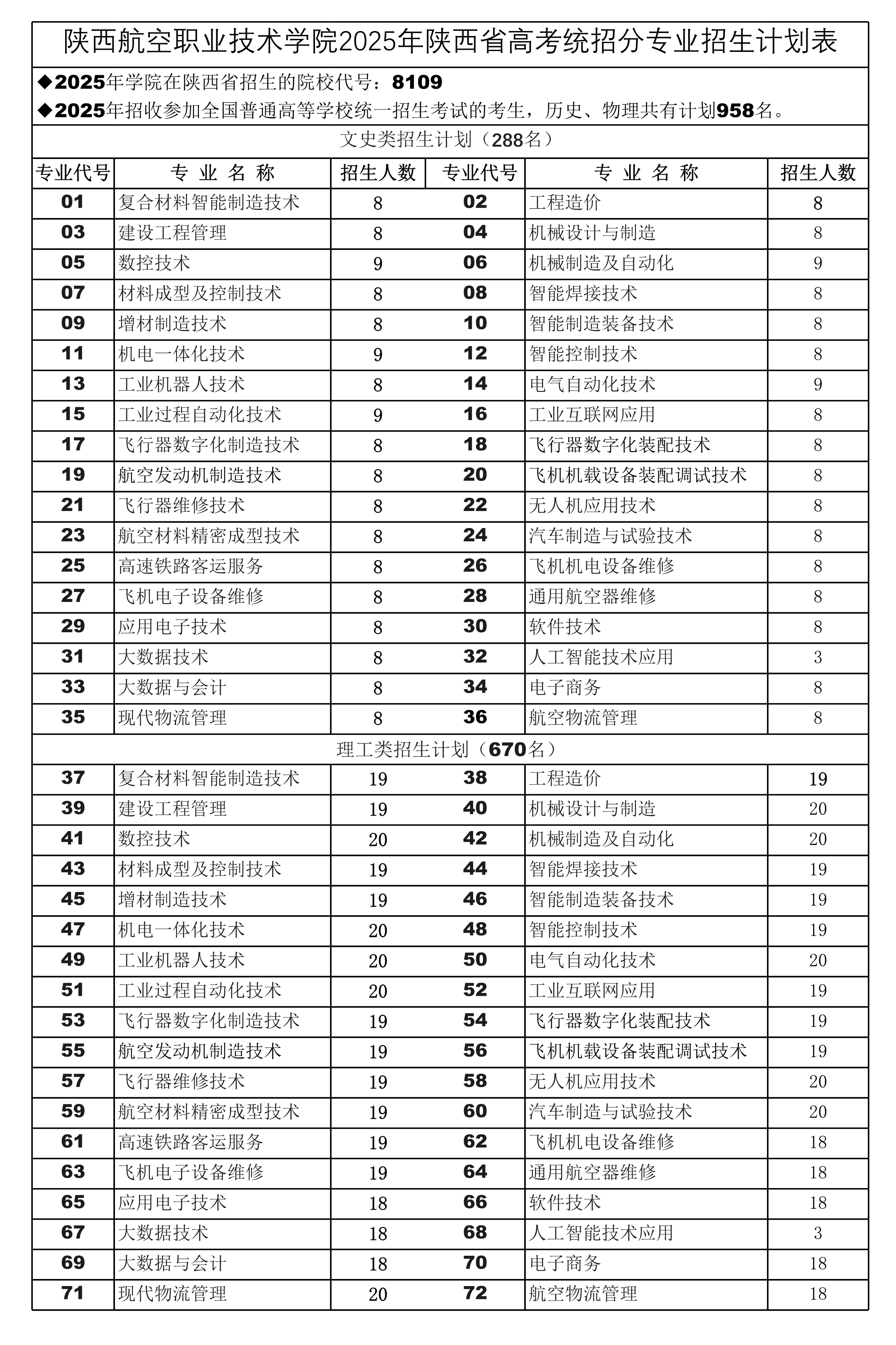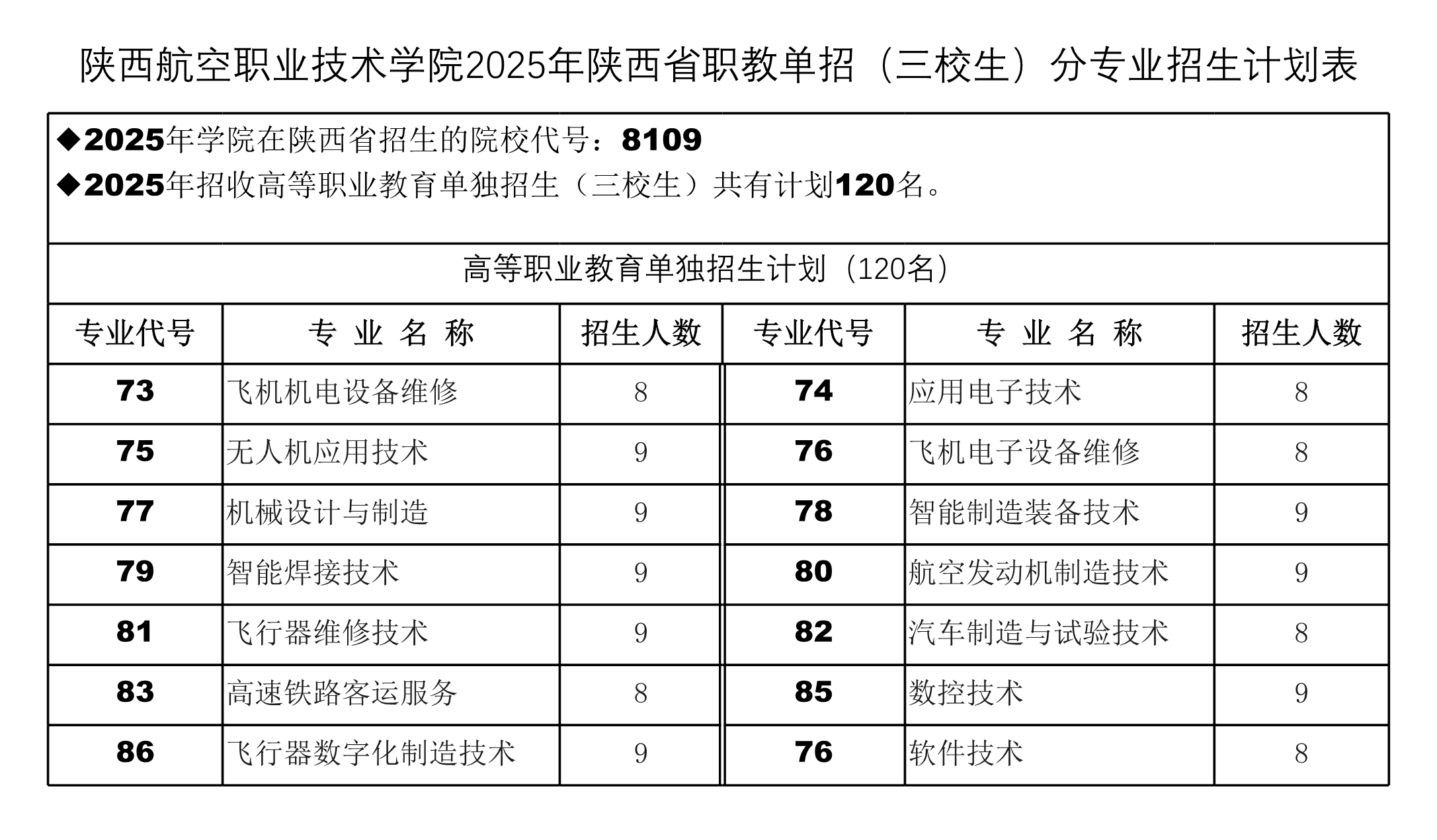 陕航职院2025年陕西省招生专业计划表