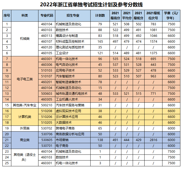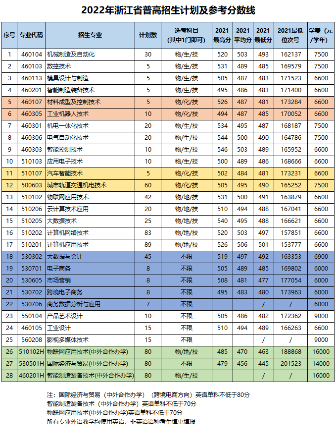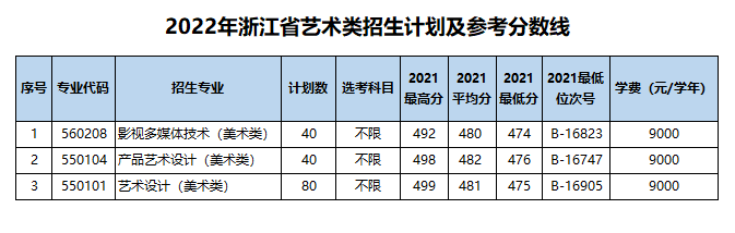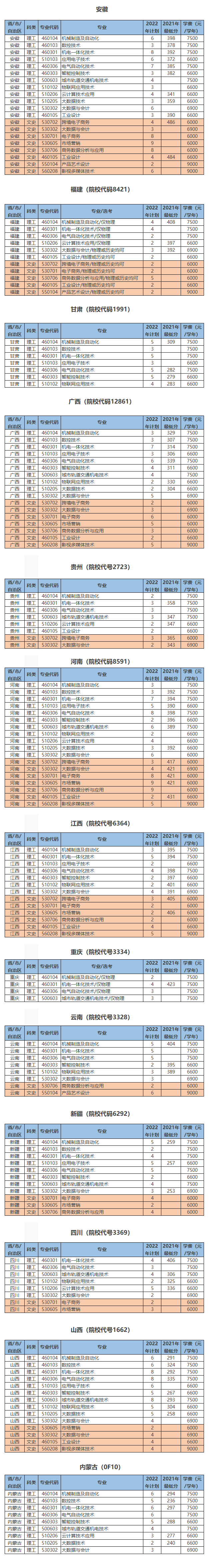 2022年,我校面向浙江、安徽、山西、内蒙古、福建、江西、河南、广西、重庆、四川、贵州、云南、甘肃、新疆等省市自治区招生。具体专业计划和参考分数线如下:考生福利:2022年浙江省普通类一段线及以上考生考入我校,成绩合格,可在一年级第二学期任选学校所有专业。