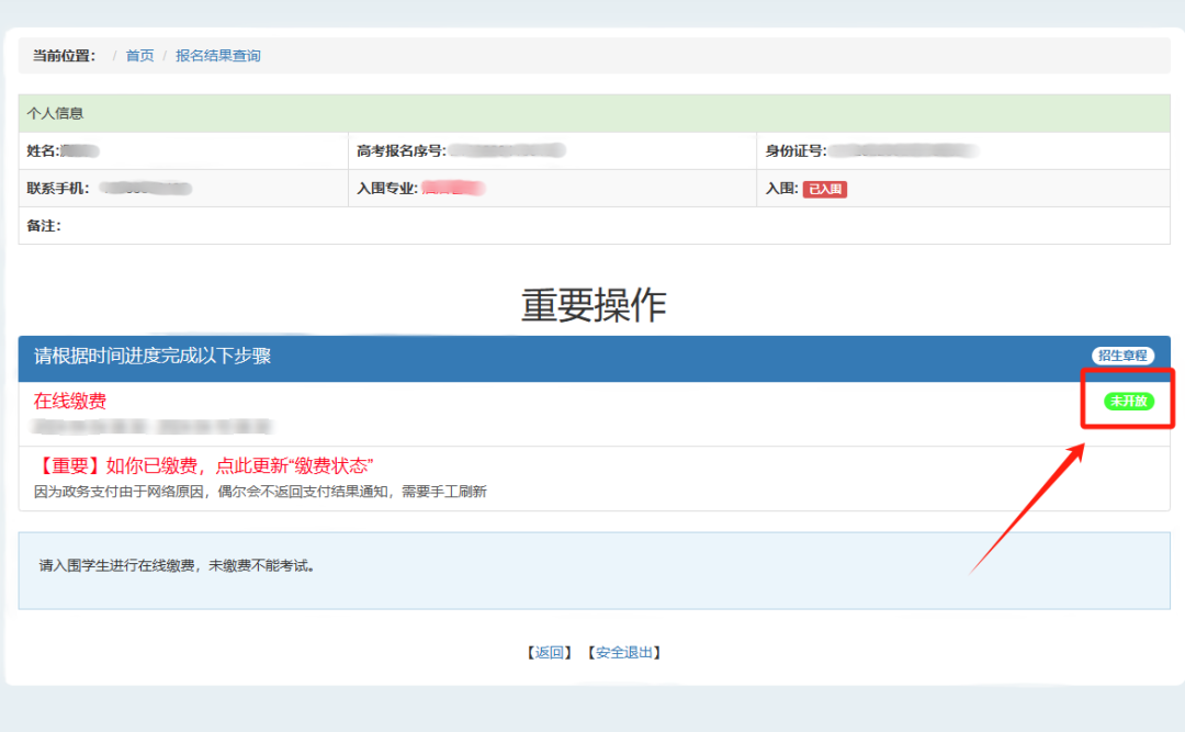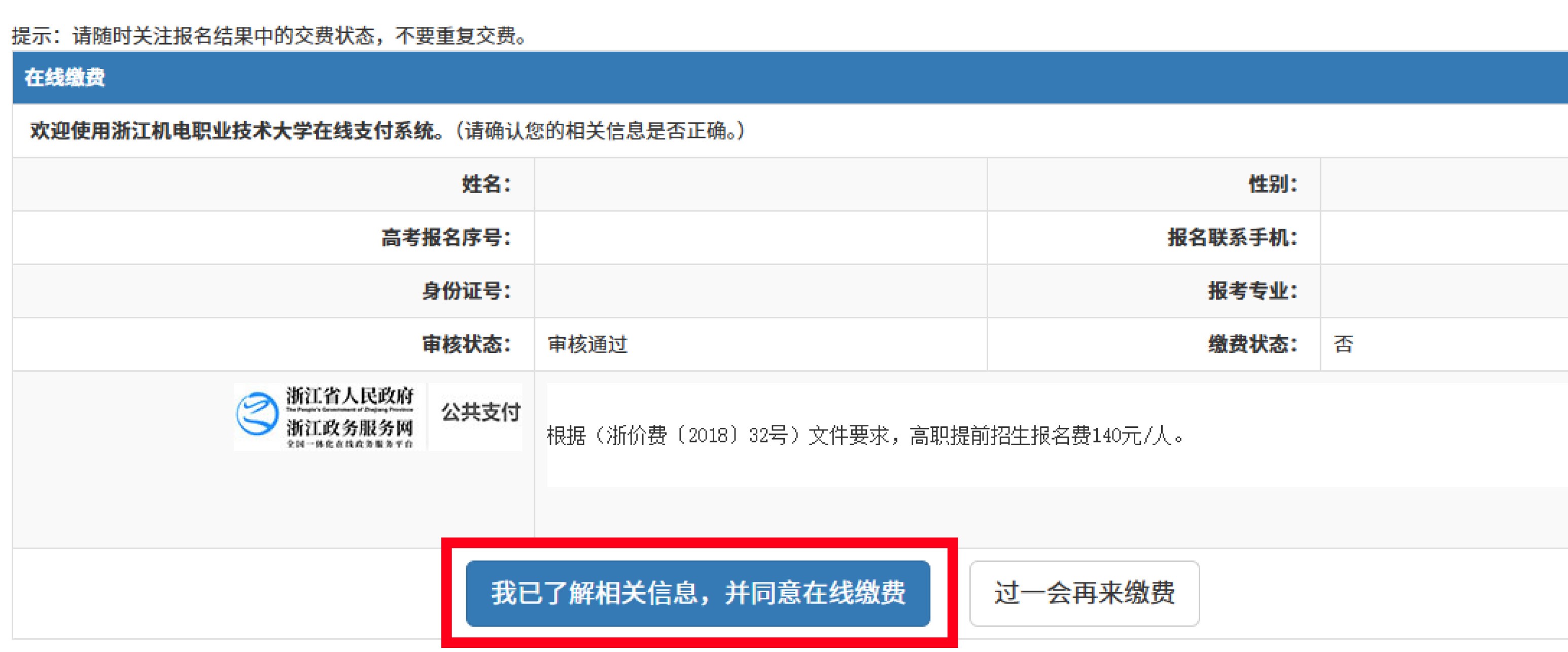 注:缴费一旦成功,不予退还。
