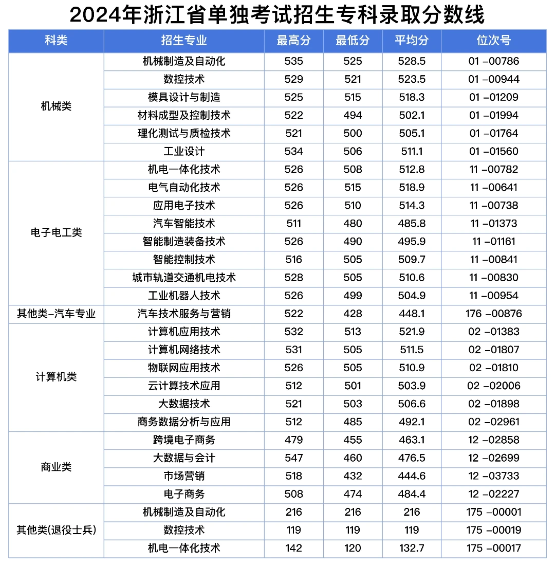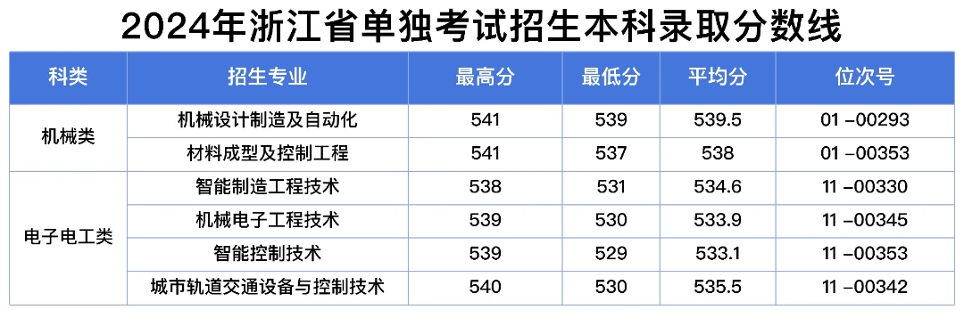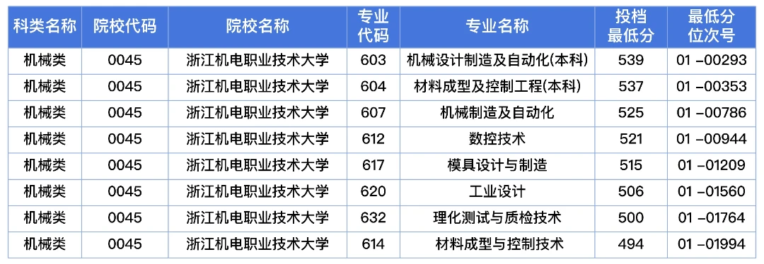 在日前浙江省教育考试院公布的《浙江省2024年单独考试招生平行投档分数线》中显示,全省本科的机械类招生中,浙江机电职业技术大学的机械设计制造及自动化和材料成型及控制工程等专业的最低投档分位居职教本科第一;在全省专科的机械类招生中,学校的机械制造及自动化、数控技术、模具设计与制造、理化测试与质检技术、材料成型及控制技术、工业设计等专业的最低投档分位居全省该专业第一名!