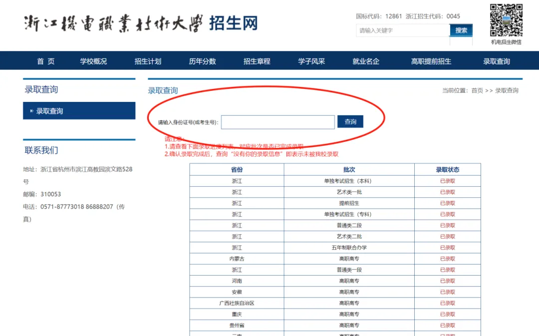 微信搜索“浙江机电职业技术学院招生”微信公众号,进入公众号,点击下方“报考指南-录取查询”,输入个人信息查询录取结果。