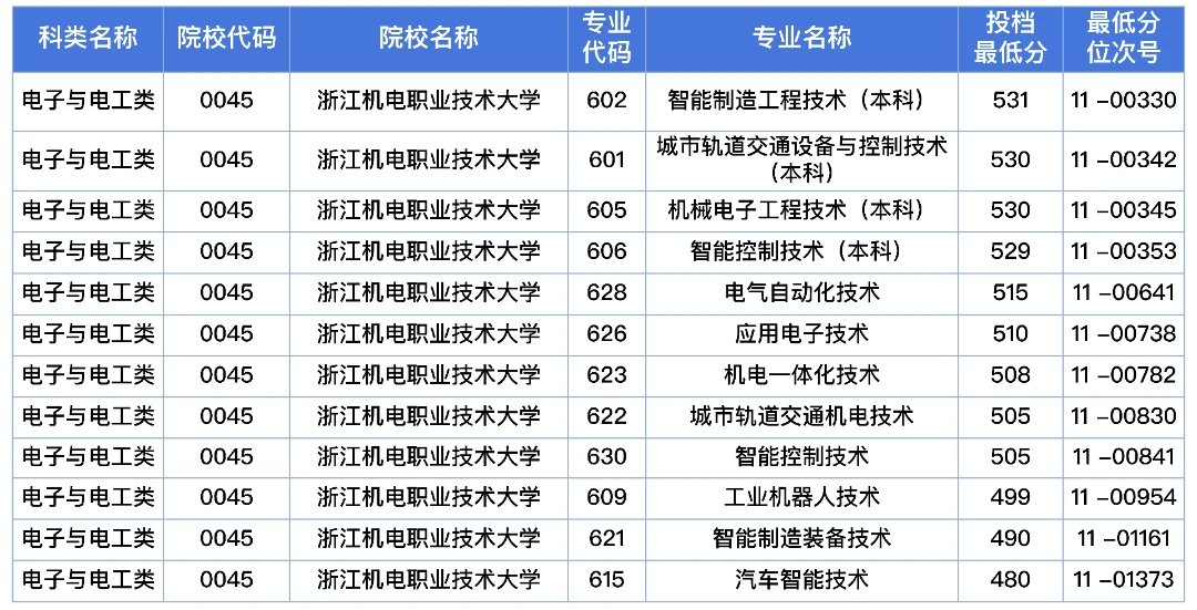 在全省本科的电子与电工类招生中,学校的城市轨道交通设备与控制技术、智能制造工程技术、机械电子工程技术和智能控制技术等专业的最低投档分位居职教本科第一;在全省专科的电子与电工类招生中,学校机电一体化技术、城市轨道交通机电技术、智能制造装备技术、汽车智能技术、应用电子技术、智能控制技术等专业最低投档分位居全省该专业第一名!