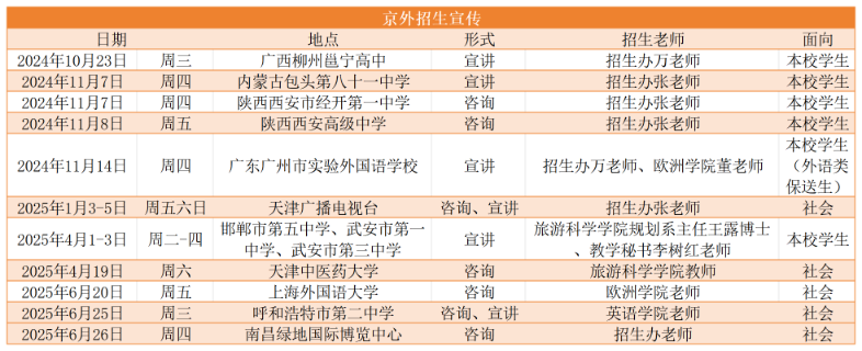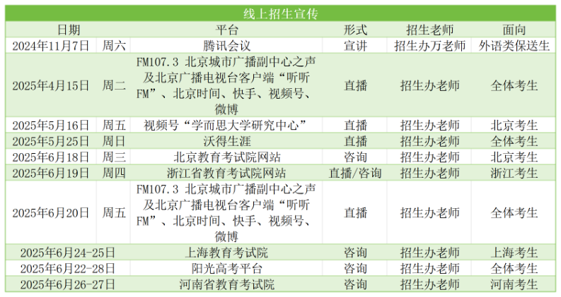 您们好!2025年度本科招生宣传活动已经启动,本科招生办将继续通过线上宣讲、电台直播、在线咨询等便捷方式,让您第一时间了解北二外招生的各方面信息,还将通过现场咨询、面对面交流的方式,贴心为您答疑解惑,欢迎大家及时关注并积极参与!以下为近期宣讲信息和参与方式,信息持续更新,请关注本科招生网——招生动态栏目(网址:https://bkzs.bisu.edu.cn)。希望更多胸怀远大理想的青年学子来北二外启航新征程,奔赴美好未来!