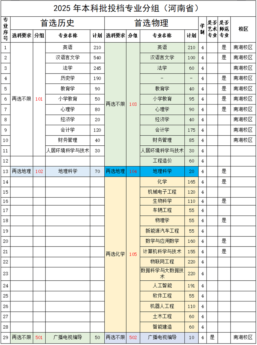 03学校28个普通本科专业共分5个专业组,其中首选历史的2个组(101组历史+不限,共11个专业;102组历史+地理,地理科学),首选物理的3个组(103组物理+不限,共11个专业;104组物理+地理,地理科学;105组物理+化学,15个专业)。1个艺术类专业(广播电视编导)分2个专业组(501组历史+不限;502组物理+不限)。
