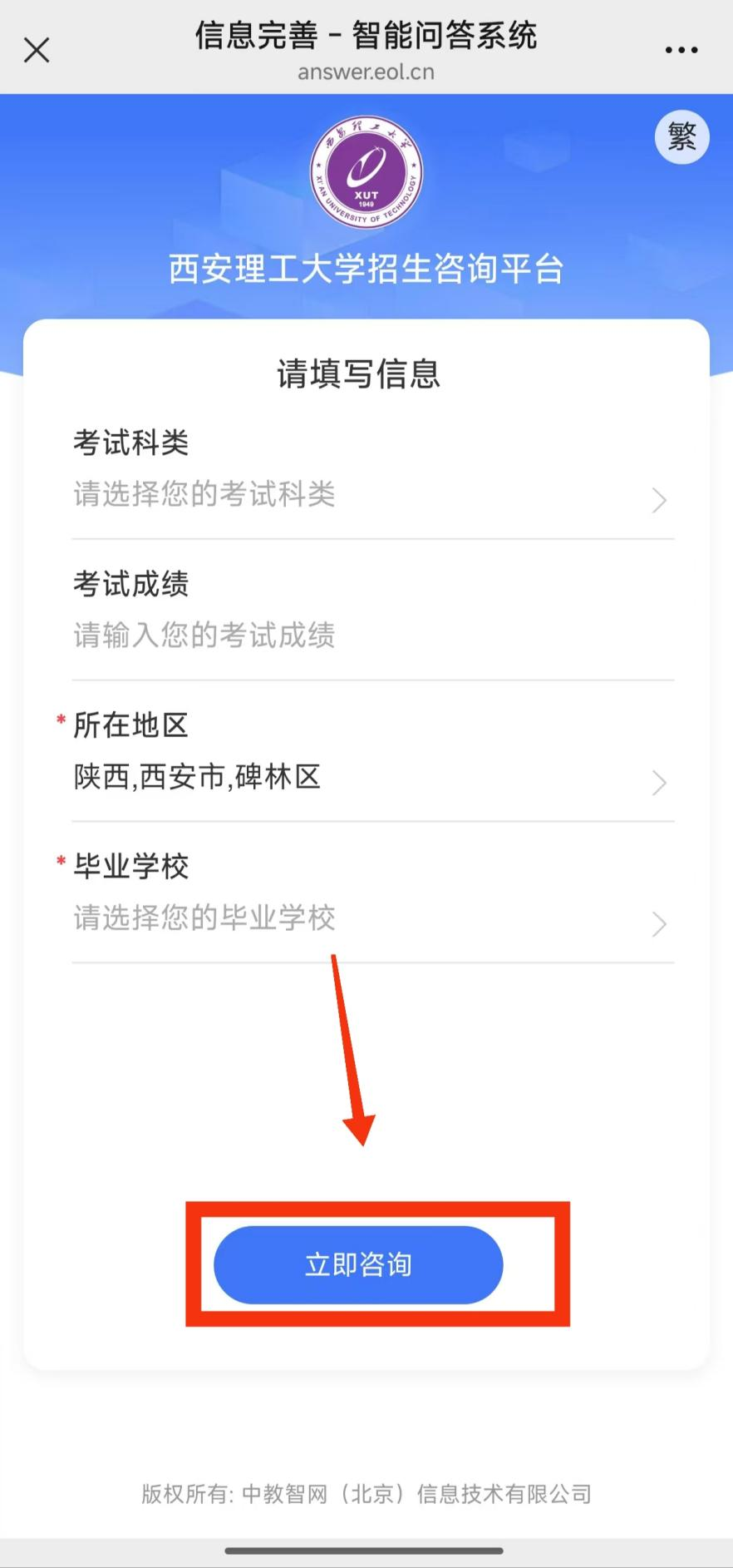 4.进入“招生咨询”,可得到以下界面,进行信息填写,随后点击“立即咨询”。