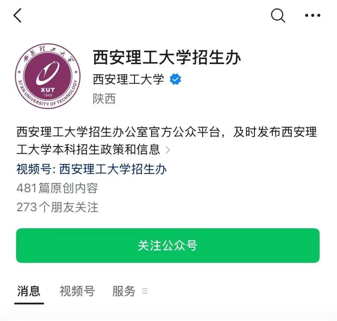 微信公众号微信搜索“西安理工大学招生办”或公众号“xaut_zsb”,或扫描微信二维码,添加关注学校招生办官方微信公众平台。最新、最全的招生资讯将在这里同步公布!