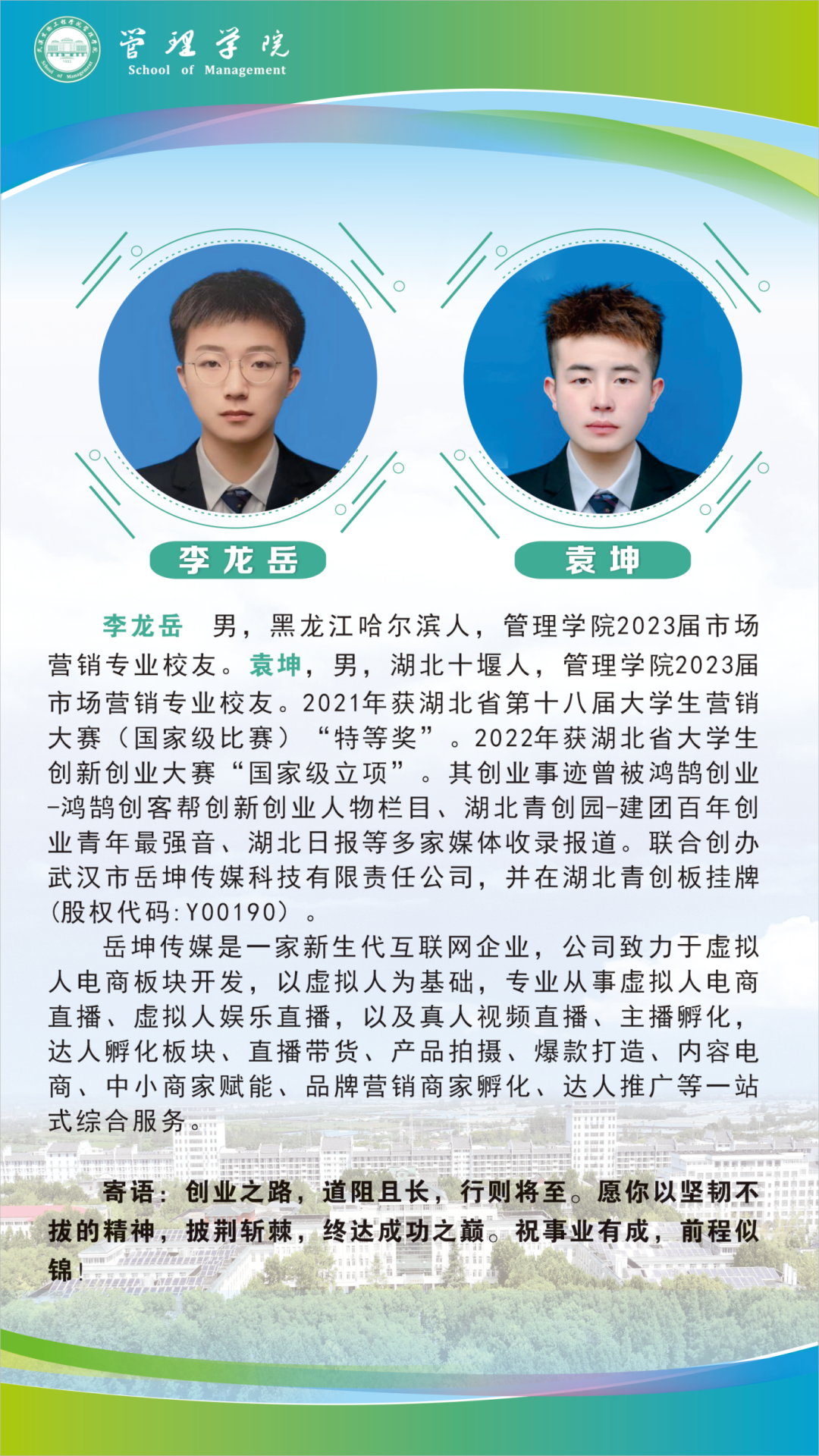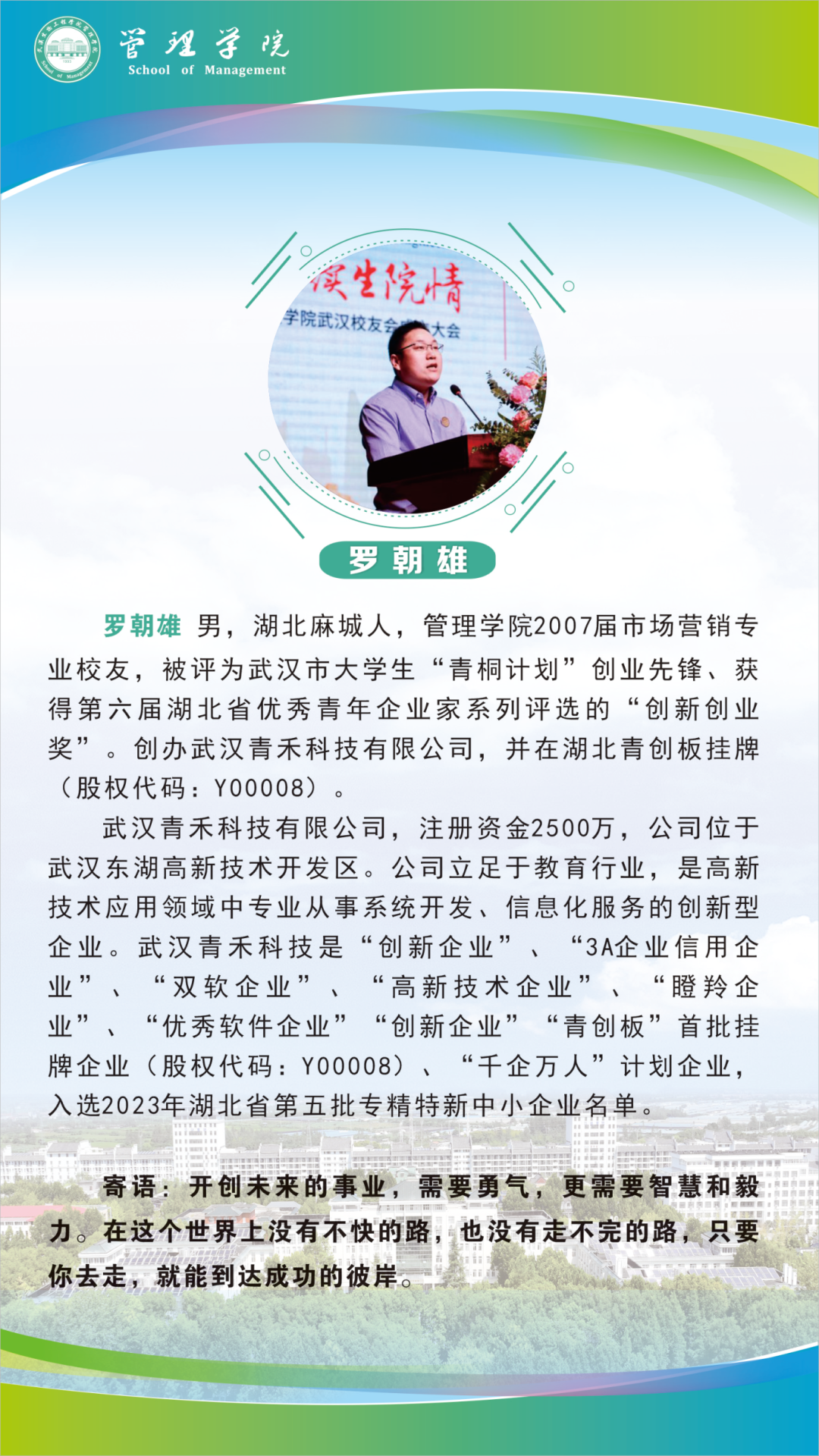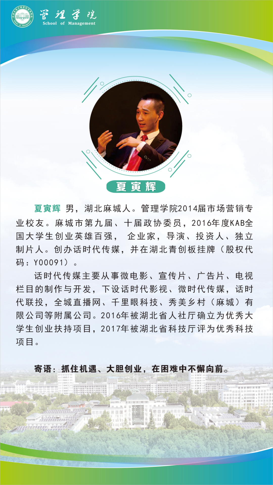 中共党员,2009届校友,连续创业者,武汉市创业天使导师团导师,“汉漾”青年人才。在校期间曾曾先后获全国企业管理挑战赛冠军、武汉市大学生创业先锋等荣誉。2021年作为特殊人才受邀回校,全面负责学校创新创业教育工作,并在培育大学生创新创业项目方面多次取得历史突破性成绩。