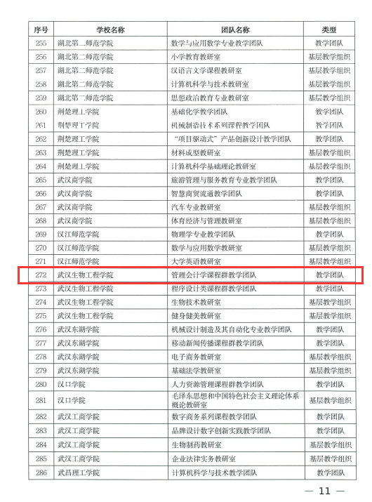管理会计学课程群教学团队,2021年荣膺湖北省高等教育优秀教学团队称号。团队主动适应"大、智、移、云、物"背景下管理会计学发展趋势,系统改革课程体系,深化教学内容,推进教学改革研究,创新教学模式,致力于提升应用型人才培养质量。