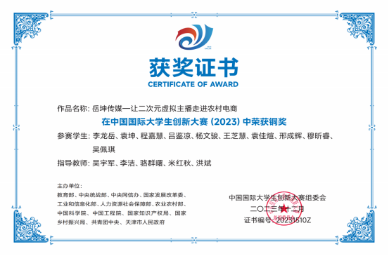 中国国际大学生创新大赛(2023)中荣获铜奖