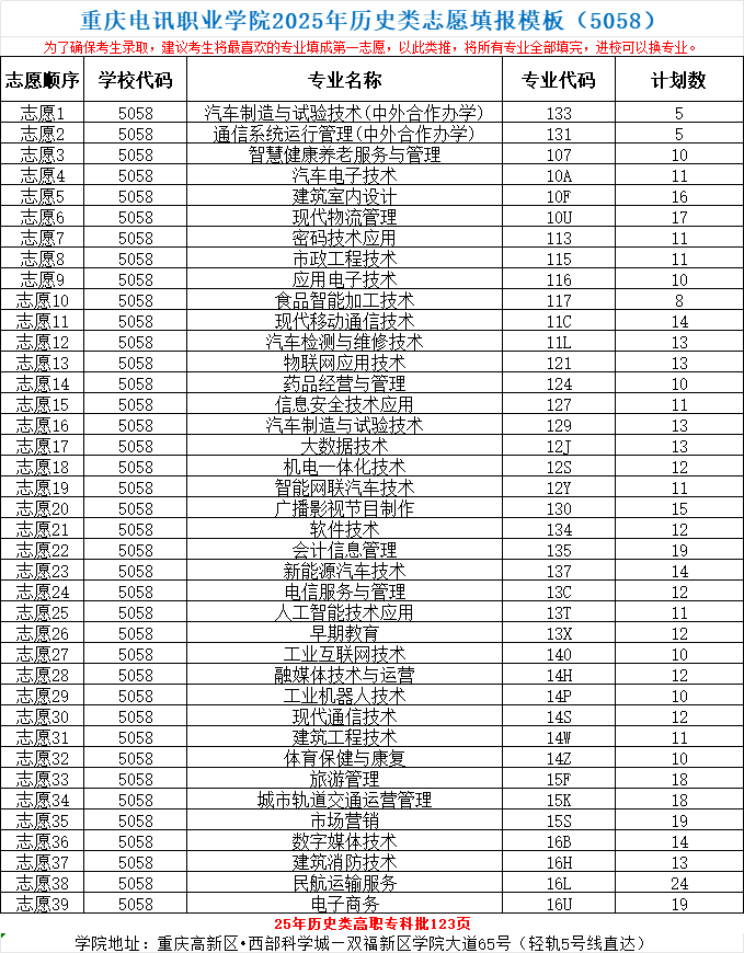 2025年重庆电讯职业学院秋季招生历史类志愿模板