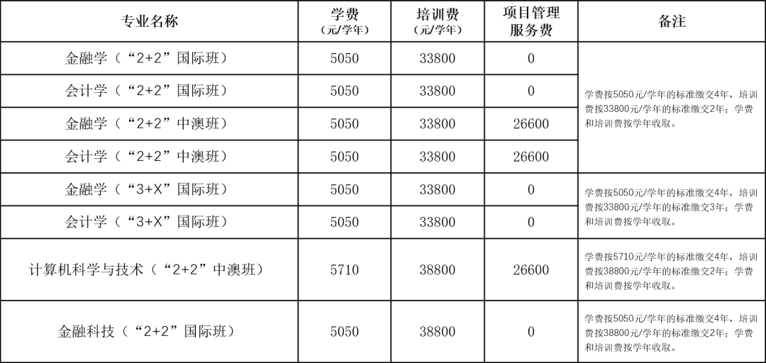 注:上表费用不含教材费和住宿费等其他费用;中澳班学生除缴交学费和培训费外,须另行一次性缴交26600元项目管理服务费(不予退还);金融学和会计学专业未出国学生按33800元/学年的标准缴纳4年培训费。