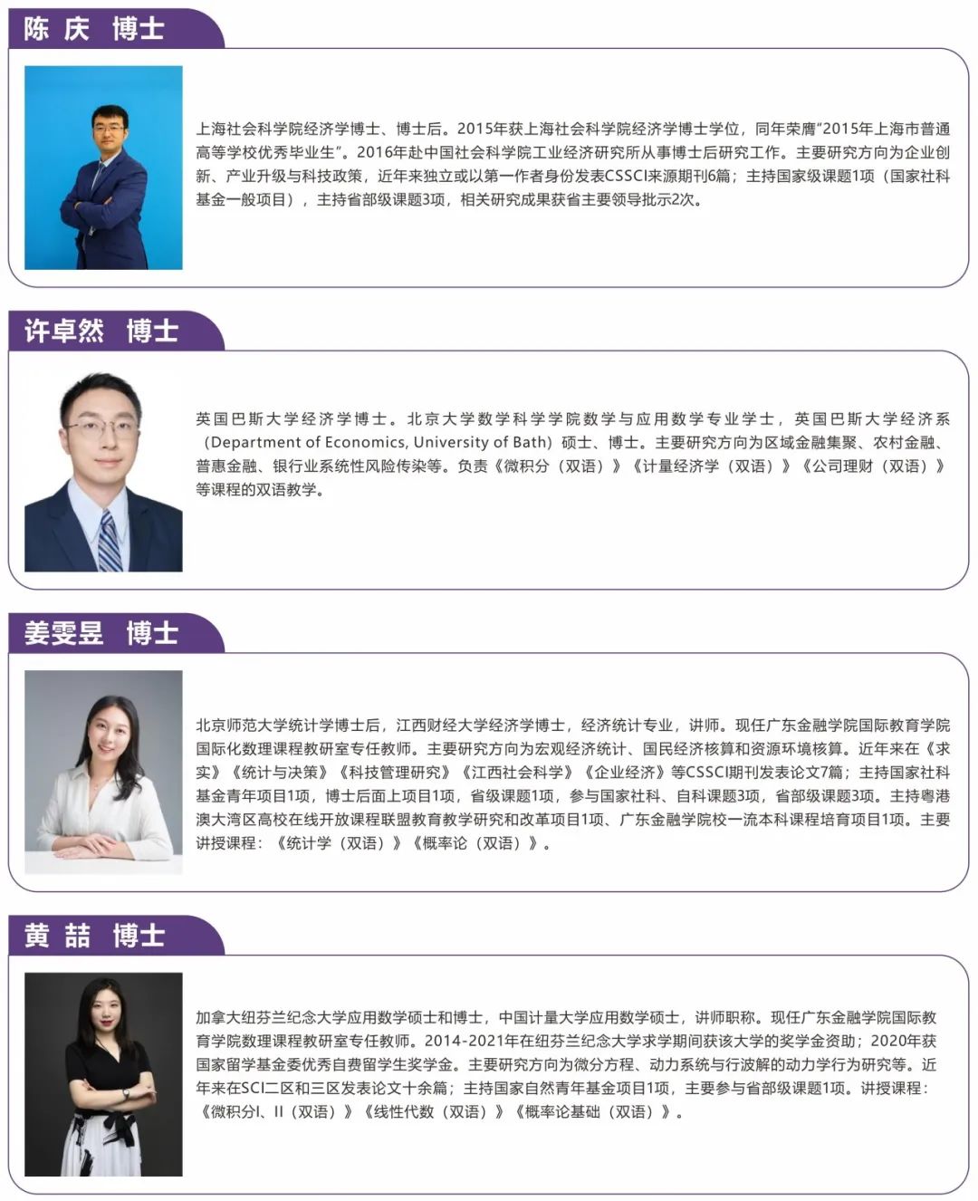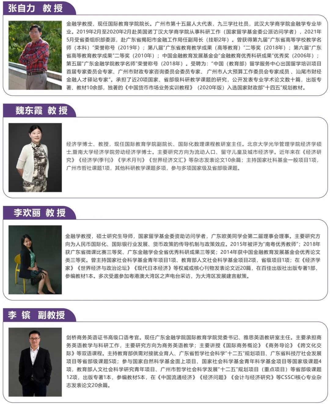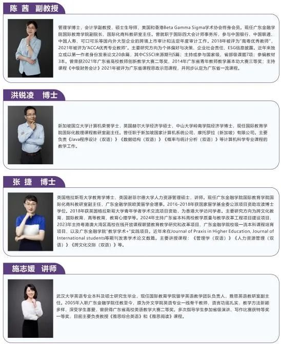 🔶学院专业课程教学团队年龄结构合理、凝聚力强、具有优秀教学科研能力。教师团队成员90%以上拥有境外留学(进修)或工作经历,80%为中青年海归博士;拥有“南粤优秀教师”3人,“广东省高等学校教学名师”1人;正高职称5人,副高职称2人;近年来5人获得5项国家自科及社科基金项目立项。